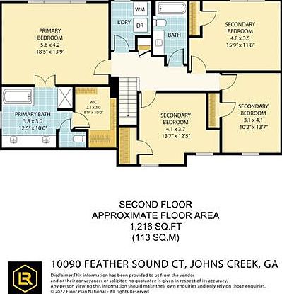 This floor plan spans approximately 1,216 square feet and features a well-designed second floor. The layout includes four bedrooms: a spacious primary bedroom measuring 18’5″ by 13’9″ with an adjoining primary bath and a walk-in closet, and three secondary bedrooms with dimensions varying from 10’2″ by 13’7″ to 15’9″ by 11’8″. Between the bedrooms is a shared bathroom and a laundry area equipped with washer and dryer spaces for convenience. Central stairs connect the floor, and the design optimizes space and flow for family living.