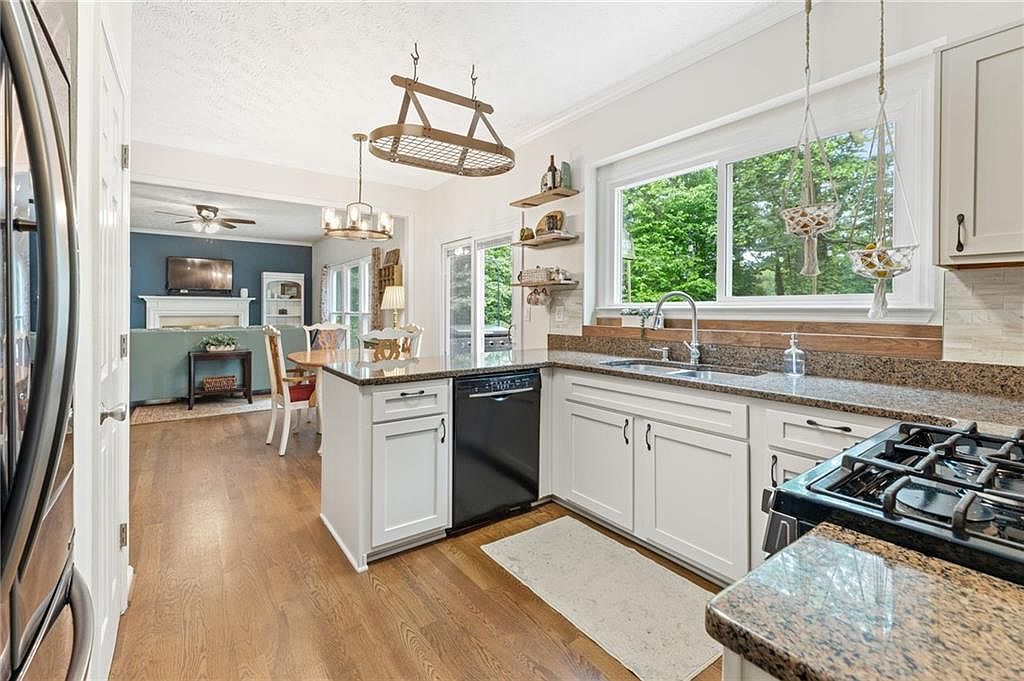 This open-concept kitchen offers a bright and airy atmosphere with its large window above the sink, showcasing a lush green outdoor view. White cabinetry with black hardware complements the earthy granite countertops, creating a balanced contrast. The kitchen island extends into the dining area, providing additional workspace and casual seating options. Warm wood flooring flows seamlessly from the kitchen into the adjacent dining and living spaces, enhancing the inviting feel. Unique hanging planters and a rustic wood-and-metal chandelier add character, while the open shelves near the window display decorative and functional items, blending style and practicality.