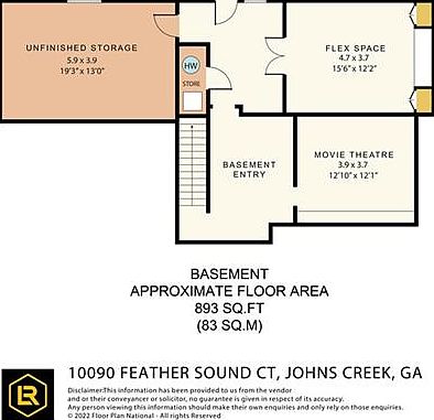 This basement floor plan spans approximately 893 square feet, thoughtfully designed to offer versatile living and storage options. The largest area, labeled unfinished storage, measures nearly 20 by 13 feet, providing ample space for belongings or potential future finishing. A flex space measuring roughly 15.6 by 12.2 feet can serve multiple purposes, such as a gym, office, or play area. Adjacent to the flex space, a dedicated movie theatre room of 12 by 12 feet is perfect for immersive entertainment experiences. The basement entry is centrally located with stair access, complemented by a small storage nook and a hot water system, balancing functionality with potential customization.
