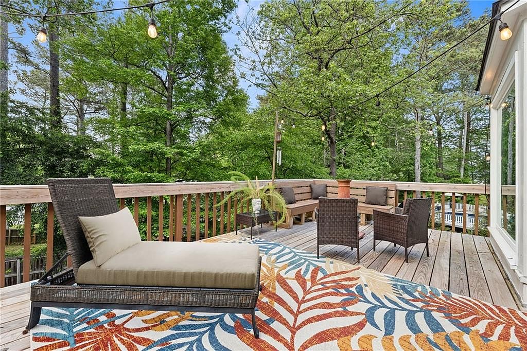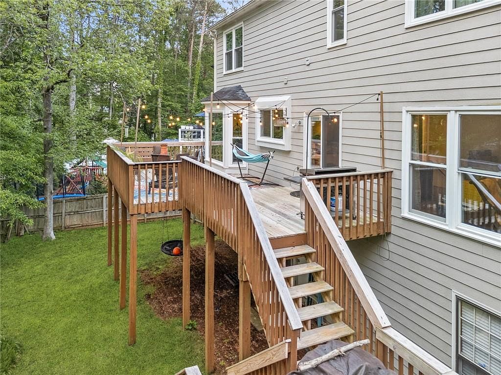 This spacious backyard deck extends from the home’s main level, featuring natural wood railings and flooring that complement the soft gray siding of the house. A set of wooden stairs descends to the lush green lawn below, which is bordered by mature trees and a privacy fence. The deck is adorned with string lights, creating a cozy ambiance for evening relaxation. A small hammock chair and fire pit area add inviting touches, making this outdoor space perfect for both quiet moments and casual entertaining. The large windows connect the interior with this serene outdoor retreat.