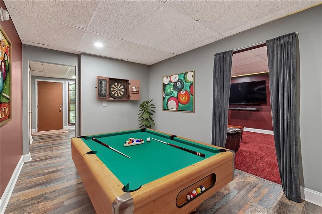 This lively game room features a classic green felt pool table occupying the center, with cues and balls neatly arranged, inviting casual play. The walls are painted in muted gray and warm reddish tones, adding both calm and vibrancy to the space. A dartboard with a wooden cabinet is mounted opposite the pool table, adding another element for entertainment. Flooring is a wood-like material with rustic, varied gray and brown hues harmonizing with the overall color palette. An adjoining room is visible through an open doorway draped with gray curtains, revealing a comfortable lounge with rich red carpeting and a large flat-screen TV. A vivid painting of pool balls enhances the gaming theme, while greenery adds a touch of freshness.