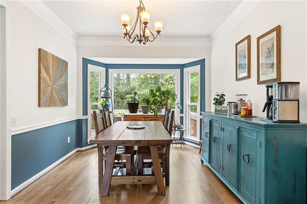 This cozy dining room features a rustic wooden table centered beneath a classic chandelier, creating a warm and inviting atmosphere. The room’s color scheme combines deep blue wainscoting with crisp white walls and ceiling, enhancing the coastal-inspired aesthetic. Natural light floods the space through a large bay window with bold blue trim, highlighting an arrangement of green plants that add a touch of freshness. Along one wall, a distressed teal sideboard holds a coffee station and decorative items, blending functionality with charm. Hardwood floors anchor the space, contributing to the overall warm, yet refined feel.