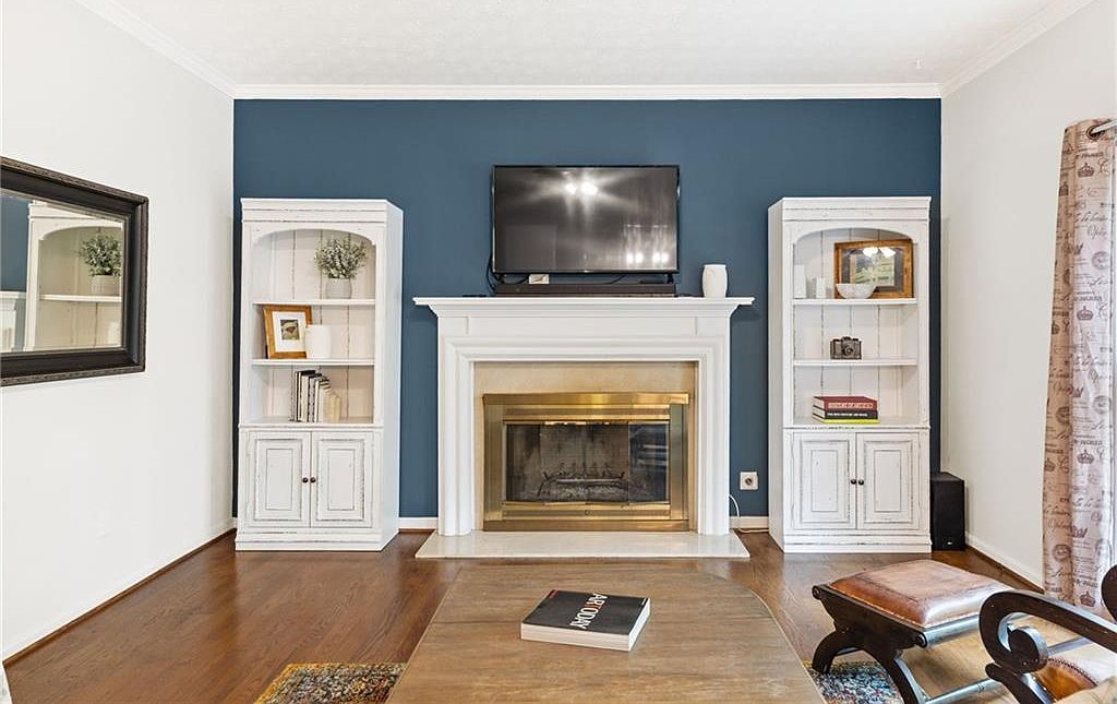 This living room focal point centers around a classic white fireplace with a brass-framed firebox, nestled against a deep blue accent wall that adds character and depth. Flanking the fireplace are two white distressed wooden cabinets with open shelving above and closed storage below, tastefully decorated with books, plants, and small decor pieces for a cozy yet curated look. The warm-toned hardwood flooring complements the wood coffee table in the foreground, which hosts a single book, contributing to the room’s inviting and uncluttered vibe. Natural light filters softly through curtains on the right, enhancing the room’s balanced, timeless charm.