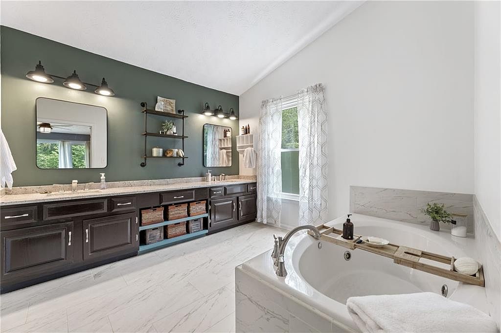 This spacious bathroom features a large double vanity with dark wood cabinetry contrasted by a warm beige granite countertop. Above the vanity, two rectangular mirrors are framed by black industrial-style light fixtures, while a muted green accent wall adds depth and a calming touch to the space. Open shelving between the mirrors holds decorative plants and accessories, enhancing the room’s modern yet functional vibe. The flooring resembles light marble tiles, extending to the bathtub surround, which is accented with matching marble. A large soaking tub sits by a window with sheer geometric white curtains, inviting natural light and fresh air into the serene, spa-like setting.