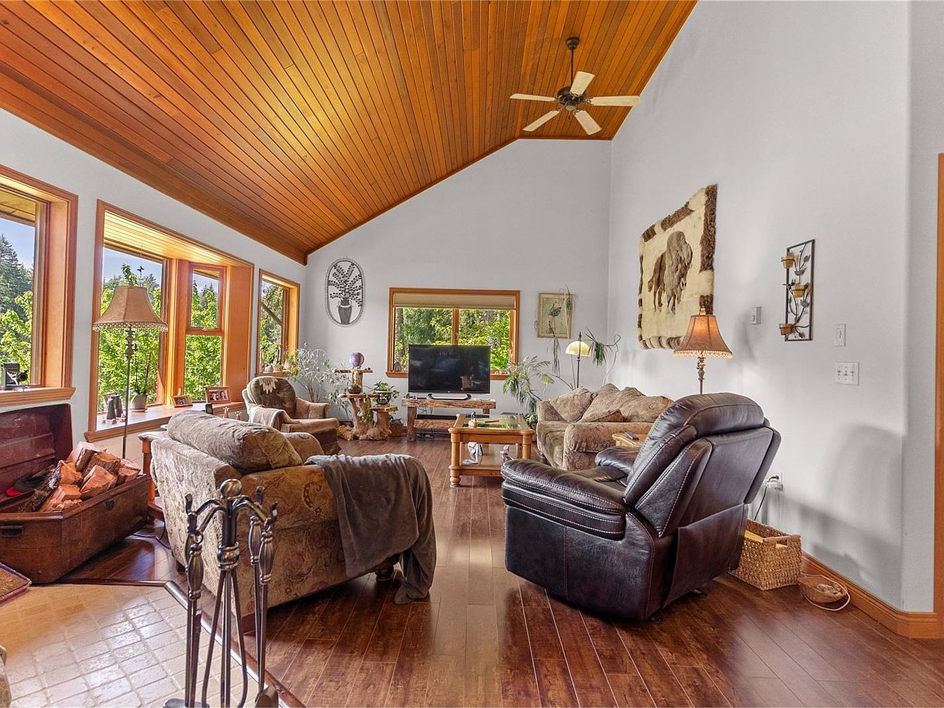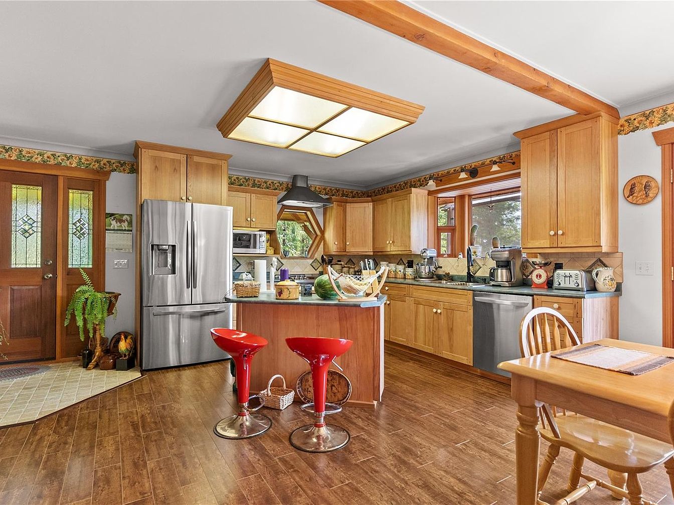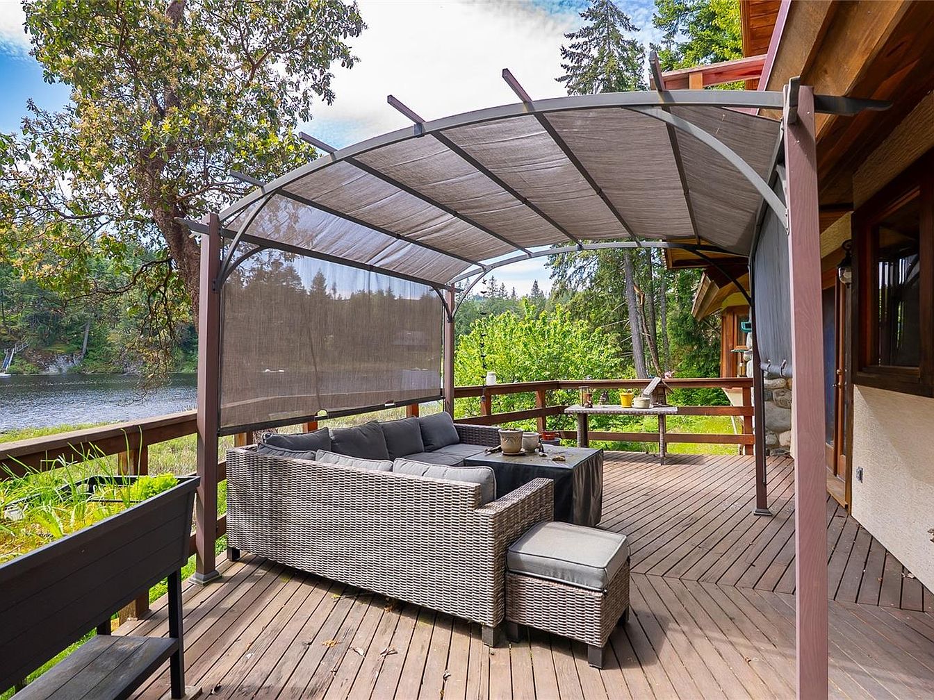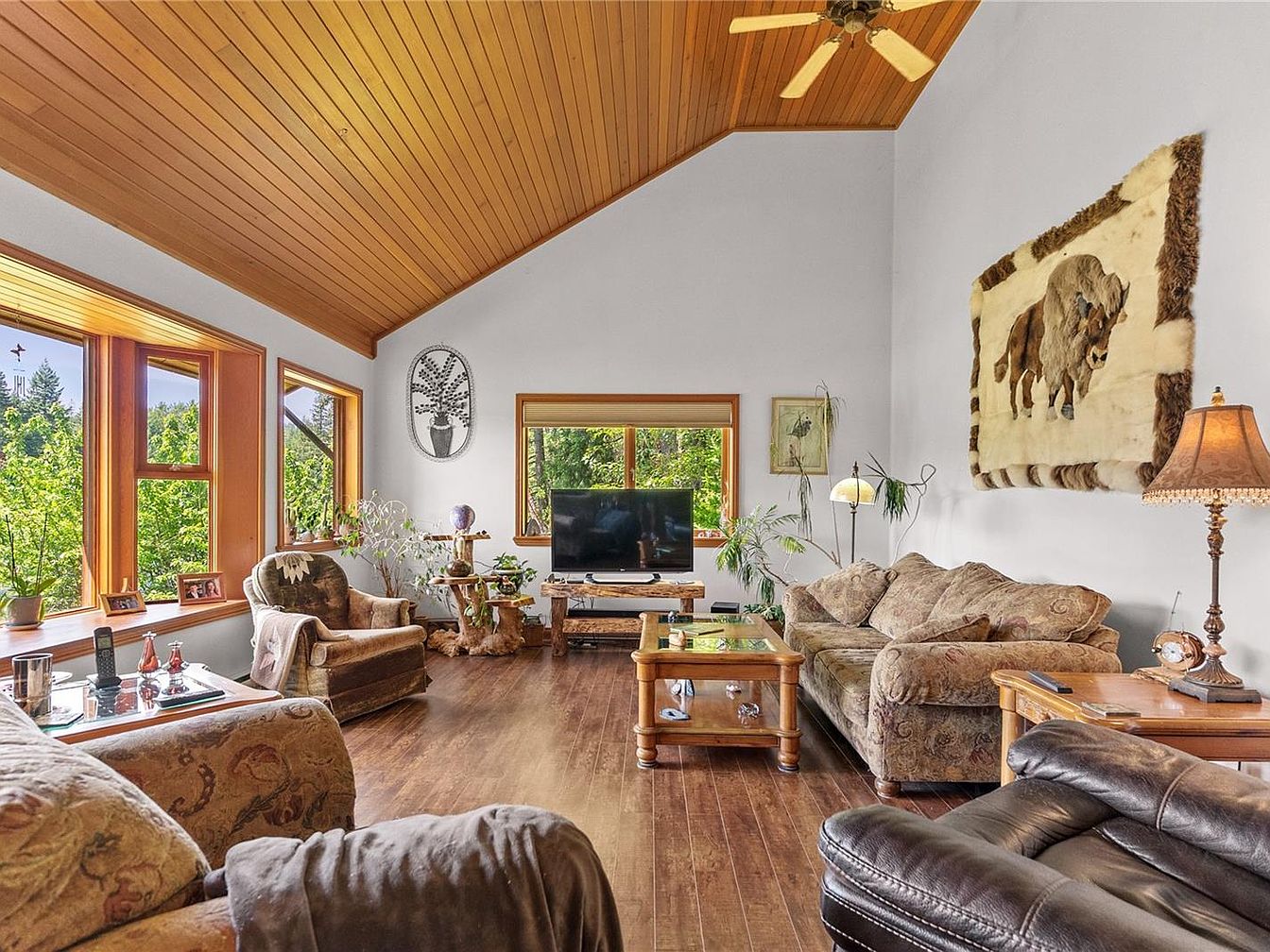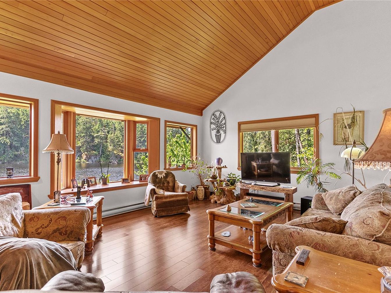 This charming waterfront home on Myles Lake in Nanaimo, BC, is a serene 2.04-acre retreat priced at $1,099,900. Boasting over 3,400 sq.ft. of total living space with nearly 2,000 sq.ft. finished, the property features a distinctive architectural style that blends rustic country charm with modern comfort. The home has a unique main floor highlighted by vaulted ceilings and a striking floor-to-ceiling fireplace that creates a cozy yet open atmosphere. The country kitchen includes a pantry and French doors that lead out to a wraparound deck, offering stunning panoramic lake views and ideal indoor-outdoor living. Built with nature in mind, the residence includes two spacious bedrooms and a loft equipped with its own private lakeview deck, perfect for enjoying the tranquil surroundings.