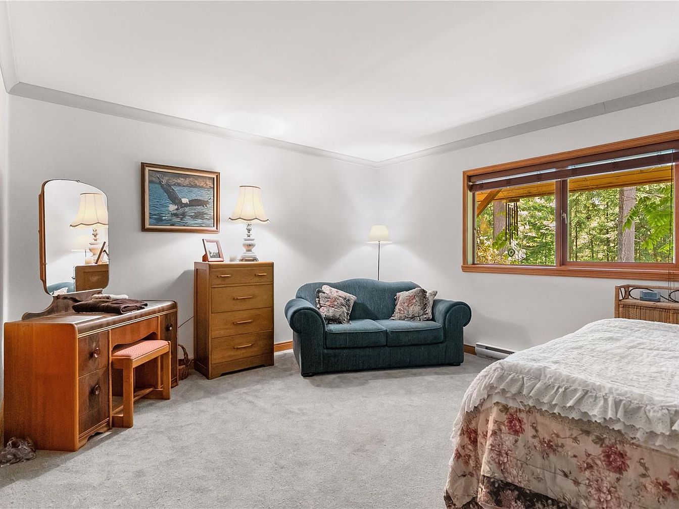 This cozy bedroom corner features a comfortable, deep blue loveseat adorned with floral throw pillows, nestled against crisp white walls. Nearby, a wooden dresser topped with a classic lamp and framed photo brings warmth, accompanied by a matching vintage vanity with an attached mirror and stool. The room’s carpet is plush and light gray, complementing the soft color palette. A large window with wood trim showcases vibrant greenery outside, enhancing the tranquil, nature-inspired atmosphere. The bedding has a floral pattern with soft ruffles, tying the room’s vintage charm and inviting ambiance together.