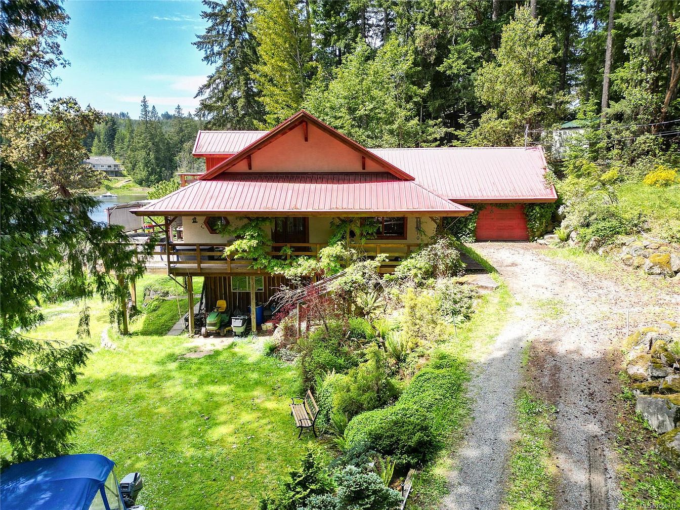 This charming home features a distinctive red metal roof with a peaked center gable and wide eaves that extend over a wooden front porch. The exterior walls are painted in warm, earthy tones, complemented by natural wood and green foliage climbing around the porch railings, adding a cozy cottage feel. A gravel driveway curves beside the house, leading to a matching red garage door, nestled amidst mature trees and lush greenery. The front yard is well-maintained with a mix of shrubs, flowering plants, and a quaint bench, creating a serene, forested retreat by the water.