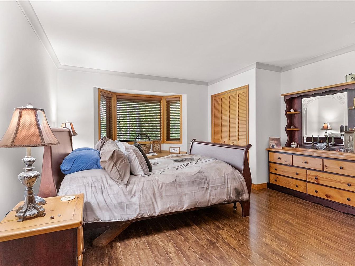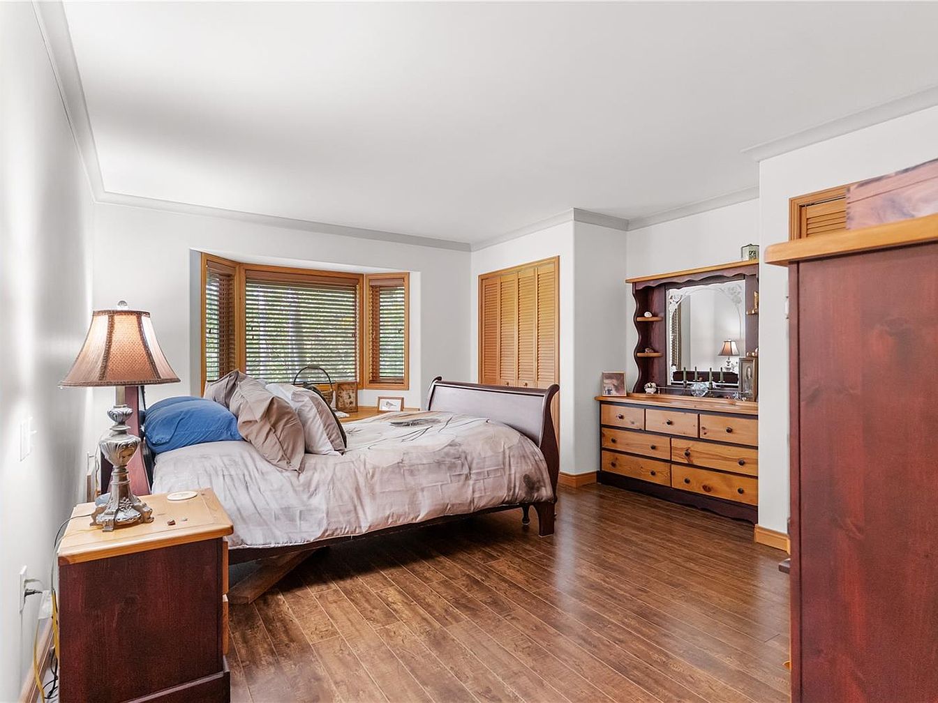 This spacious master bedroom combines classic and cozy elements with a warm wood tone theme. The polished hardwood floors complement the wooden bed frame, dresser, and nightstand. A bay window with wooden blinds brings in natural light and adds architectural interest, accompanied by a built-in bench area perfect for reading or display. The white walls balance the rich wood, creating a bright, airy atmosphere. A table lamp with a traditional shade provides soft lighting beside a neatly made bed dressed in neutral-toned bedding accented with blue. Ample storage is provided by the closet with louvered doors and a large dresser with a framed mirror, enhancing functionality and charm.