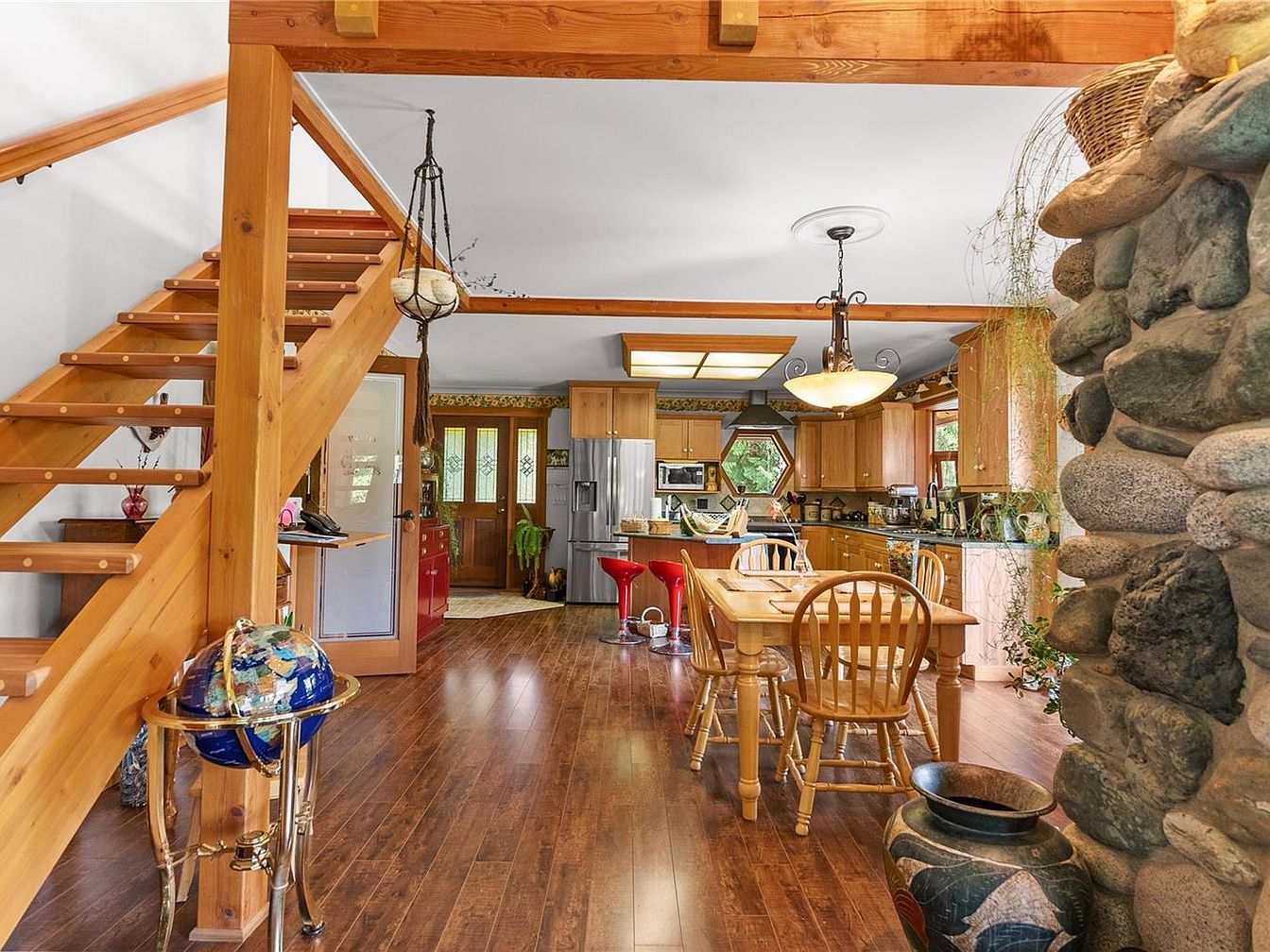 This inviting open-plan space blends kitchen and dining seamlessly with warm natural wood tones dominating the design. The polished hardwood floor complements the honey-colored wooden dining table and matching chairs situated centrally under a decorative ceiling light fixture. The kitchen features light wood cabinetry accented by granite countertops and stainless steel appliances, including a refrigerator and microwave. Unique architectural elements include a floating wooden staircase with visible joints, a large stone fireplace structure to the right, and a globe stand near the stairwell. Bright windows and a hexagonal glass detail let in natural light, enhancing the warm and cozy atmosphere.