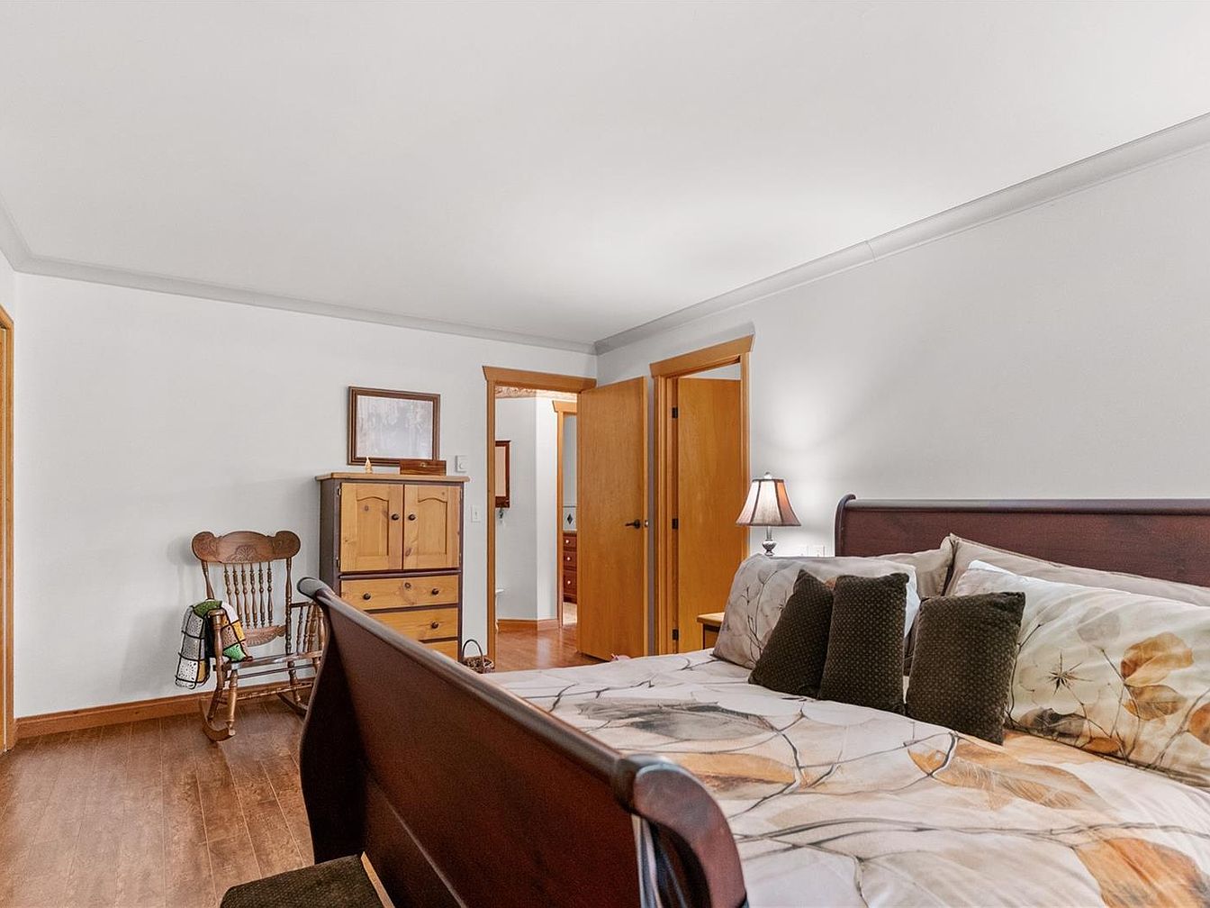 This spacious master bedroom features a warm, inviting atmosphere with a mix of traditional and cozy elements. The room is anchored by a dark wood sleigh bed dressed in a soft, patterned comforter with earthy tones and multiple dark accent pillows. Natural wood trim and doors add warmth and contrast nicely with the bright white walls and ceiling. Classic hardwood flooring runs throughout, enhancing the room’s timeless appeal. A rustic wooden rocking chair with a decorative throw and a light wood chest of drawers offer functional charm. Soft lighting from a bedside lamp creates a comforting ambiance. The layout includes two open doorways leading to adjacent rooms, enhancing flow and accessibility.