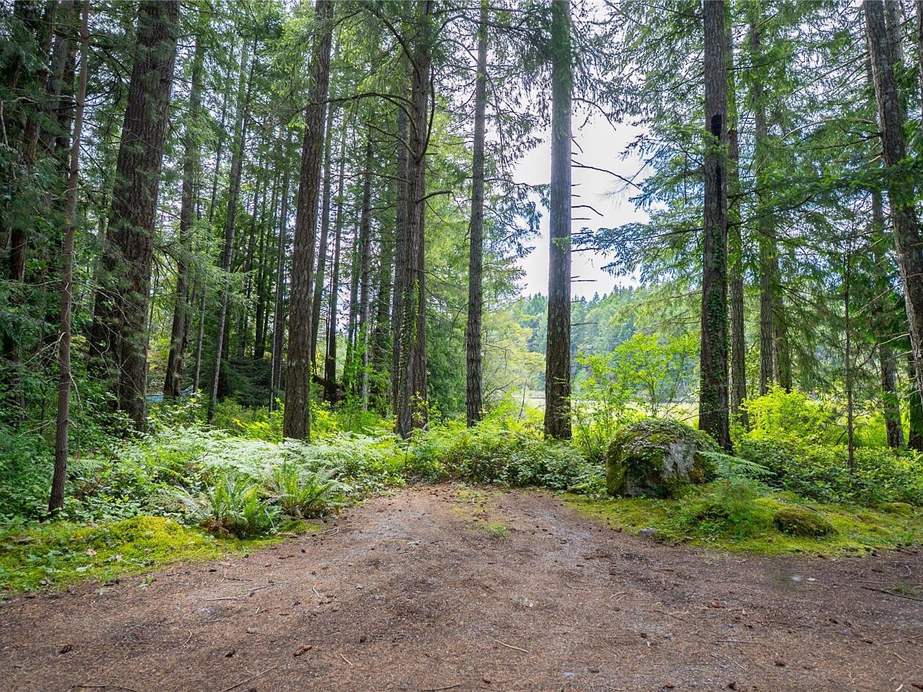This serene outdoor area showcases dense woodland perfect for nature lovers, featuring tall evergreen trees that create a canopy of green, allowing dappled sunlight to filter through. The ground is covered in natural forest floor elements such as moss, ferns, and low shrubs, adding texture and a vibrant palette of greens and earthy browns. A few scattered large rocks blend harmoniously into the landscape. The openness at the center suggests a path or clearing, inviting exploration. This peaceful setting offers a seamless connection to the surrounding natural environment, ideal for outdoor activities or contemplative moments close to home.