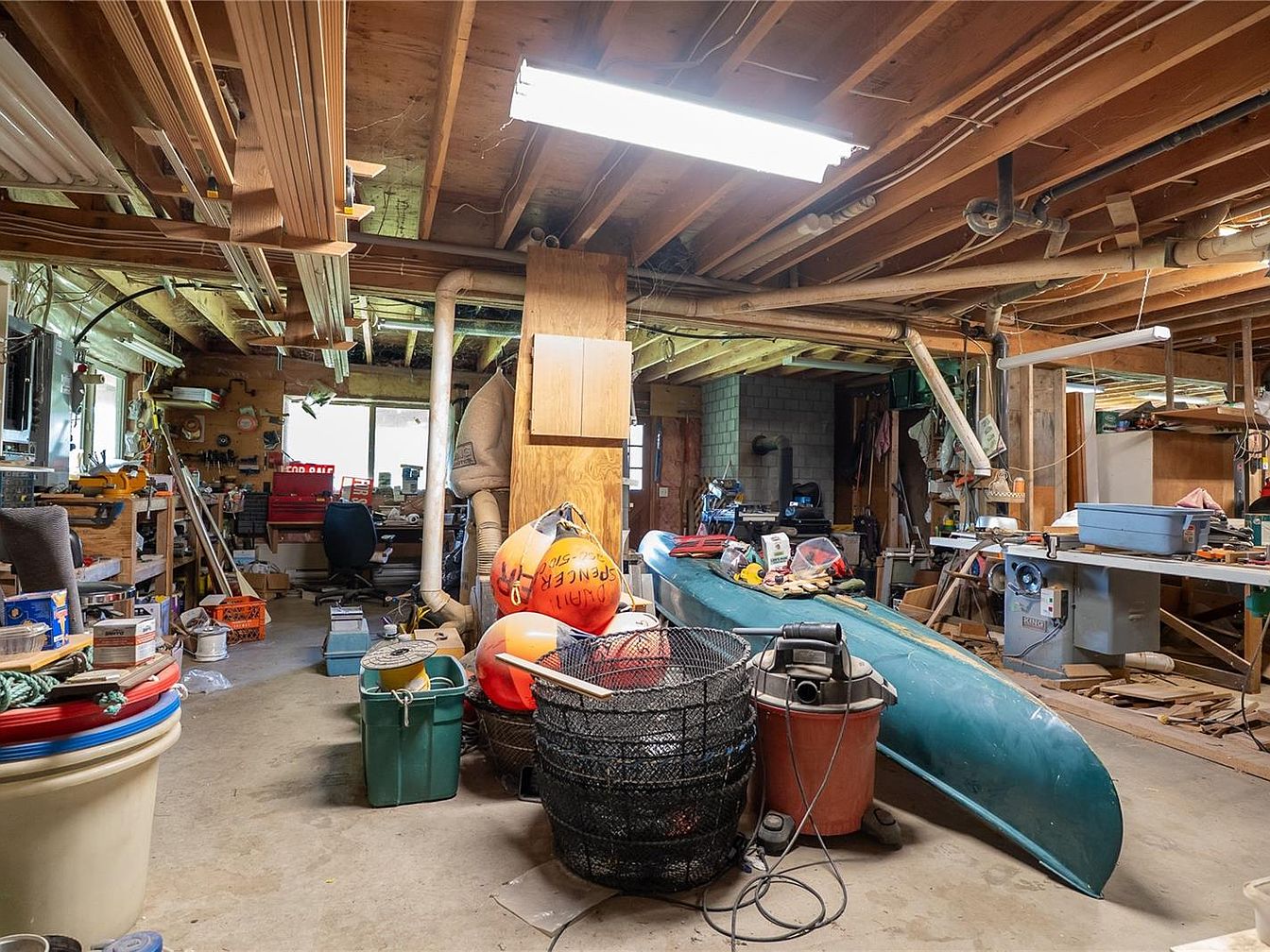 This basement space serves as a functional workshop and storage area, characterized by exposed wooden beams and an unfinished ceiling. The concrete floor provides durability for a variety of projects. Natural light filters in from small windows, complementing the overhead fluorescent lighting. A mix of workbenches and shelving lines the walls, holding assorted tools and supplies, creating a practical environment. The presence of a kayak, several buoys, and various outdoor gear indicate a multi-use storage zone. The space feels utilitarian, with a focus on hands-on work, organization and storage rather than decoration, emphasizing practicality and craftsmanship.