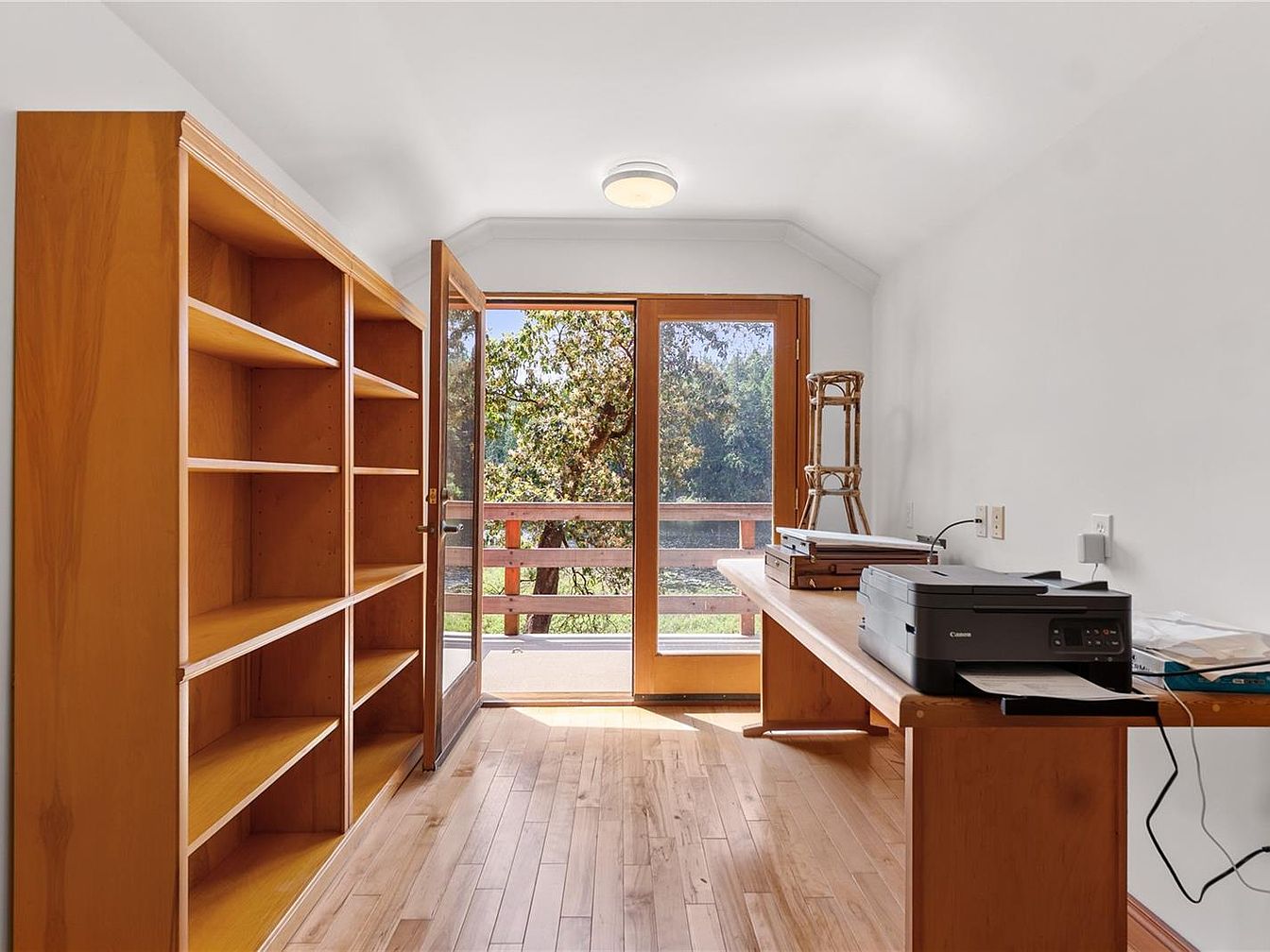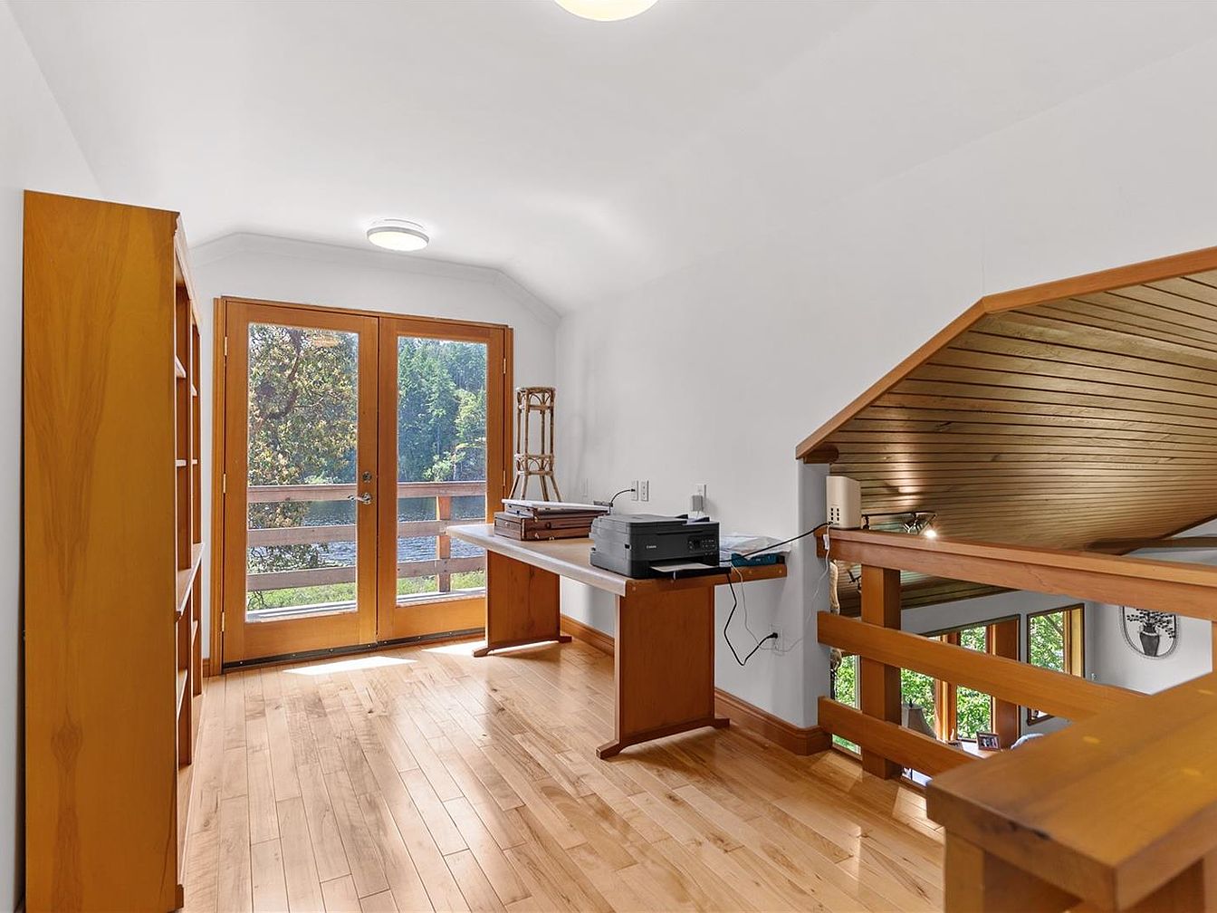 This bright and airy loft space serves as a home office with a clean, minimalist design. Natural light floods in through the double glass doors framed in warm wood, offering a scenic view of greenery outside. The room features light hardwood flooring that complements the wooden furniture, including a sturdy desk and tall shelving unit for storage. The ceiling is white and slightly vaulted, creating a spacious feel. A wooden railing separates the loft from the floor below, which is accented by a slanted wooden ceiling overhead, adding architectural interest and warmth to the space.