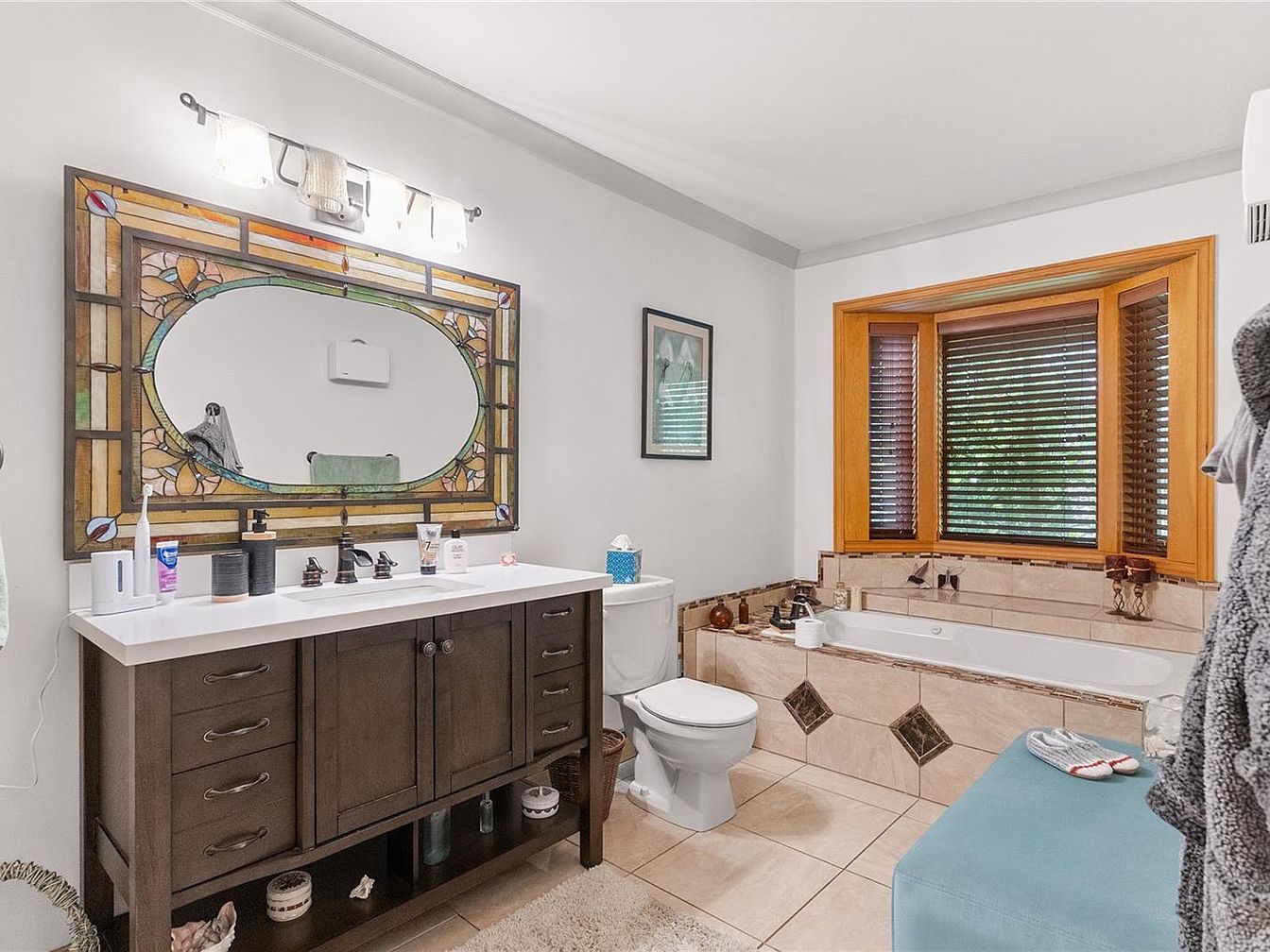 This bathroom features a rich, dark wood vanity with ample storage, topped by a sleek white countertop. Above it, a large, decorative stained-glass framed mirror serves as an artistic focal point, paired with modern light fixtures providing bright, even illumination. The space includes a white toilet situated between the vanity and a deep built-in bathtub, adorned with neutral beige and brown tiles that create a warm, inviting contrast. A wooden-framed bay window with horizontal blinds brings natural light and privacy. A soft blue cushioned bench and coordinated decor complete this tasteful, balanced design.