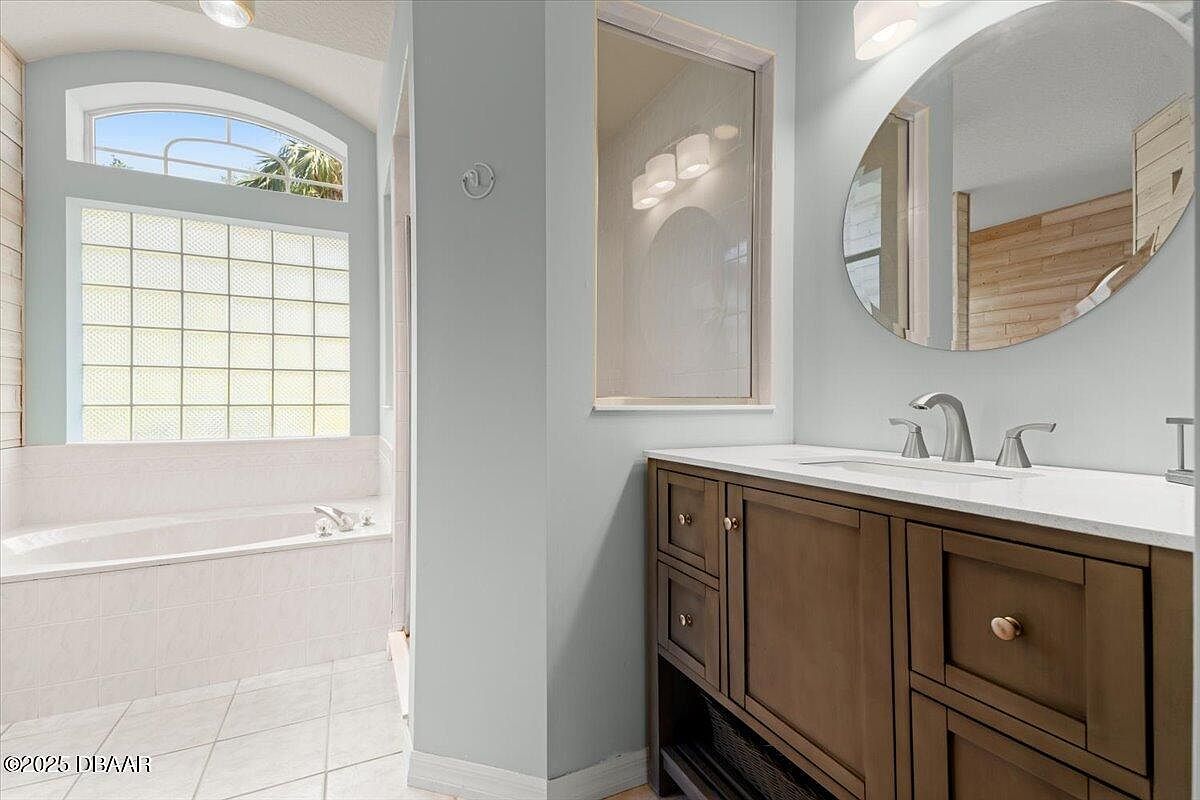 This bathroom highlights a harmonious blend of soft gray walls and clean white tile flooring, creating a soothing atmosphere. The dark wood vanity offers ample storage with multiple drawers and a modern white countertop featuring dual brushed nickel faucets beneath a round mirror. Adjacent to the vanity is a spacious soaking tub framed by white tiles, set beneath a large glass block window allowing diffused natural light while maintaining privacy. An arched transom window above adds architectural interest, enhancing the brightness and airiness of this tranquil bathroom retreat.