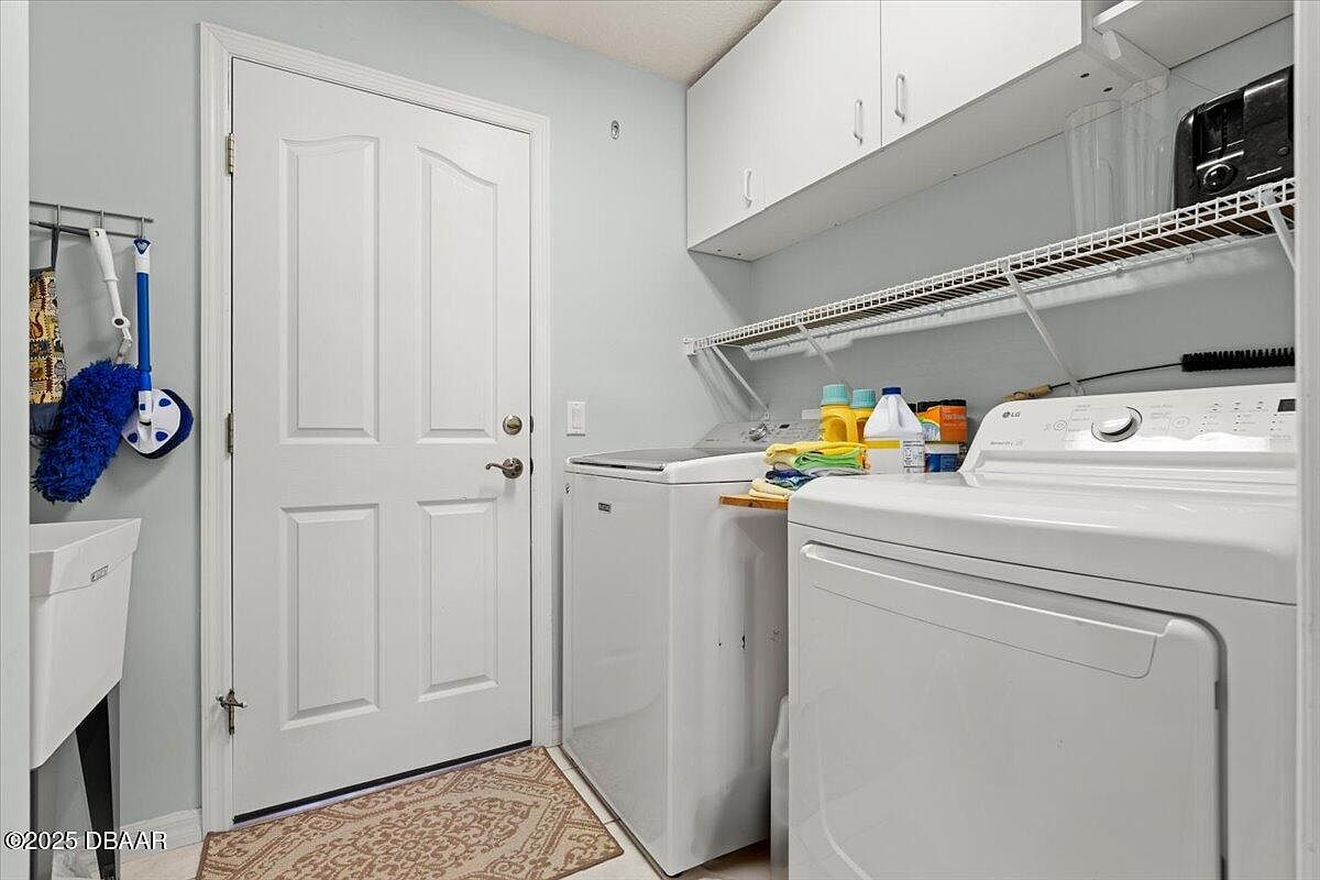 This compact laundry room combines functionality with a clean, modern aesthetic. A white washer and dryer set line one wall beneath a sturdy white wire shelf, which holds various laundry supplies. Above the shelf, white cabinetry provides additional storage, enhancing the room’s organized feel. The light gray walls complement the white fixtures and cabinetry, creating a bright, neutral space. A small utility sink is positioned beside cleaning tools hanging on a wall-mounted rack near a simple white door. The beige patterned rug adds warmth and texture to the tiled floor, completing the room’s practical, tidy ambiance.