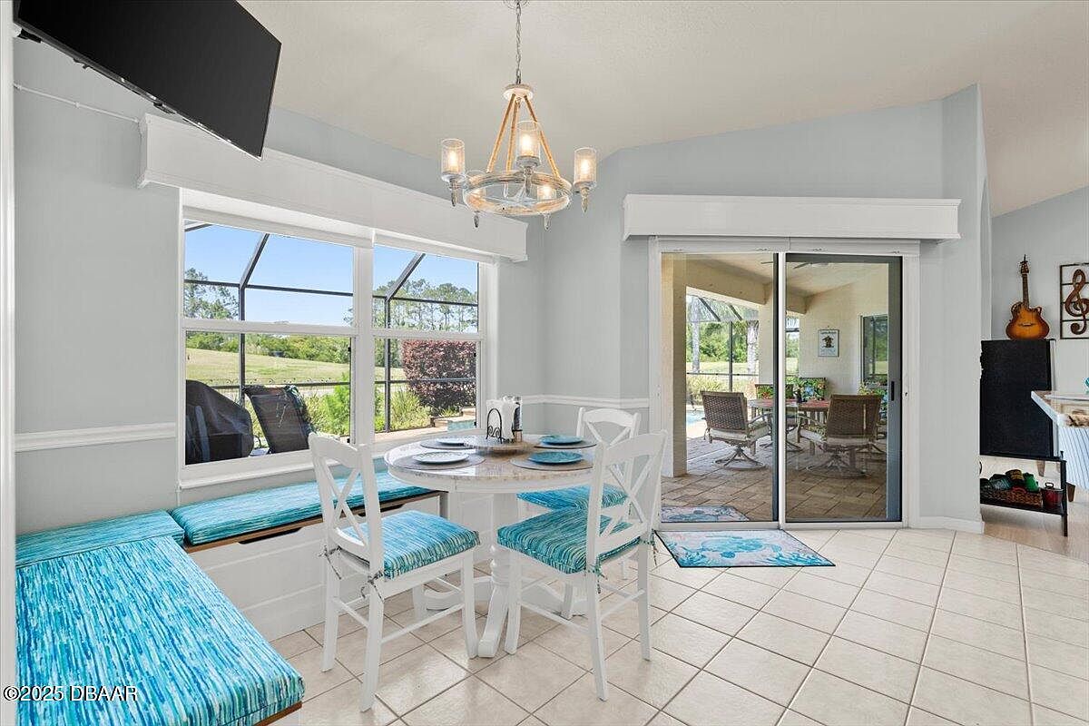 This cozy breakfast nook features a built-in window bench with vibrant aqua and turquoise cushions that bring a lively splash of color to the neutral light gray walls and white trim. A round white table is paired with matching white chairs adorned with similar blue cushions, creating a harmonious seating arrangement. The space is illuminated by a rustic chandelier with exposed bulbs and glass shades, adding warmth and charm. Large windows and sliding glass doors overlook a screened patio and lush greenery, offering an inviting blend of indoor comfort and outdoor scenery. The light tiled floor enhances the airy atmosphere of this casual dining area.