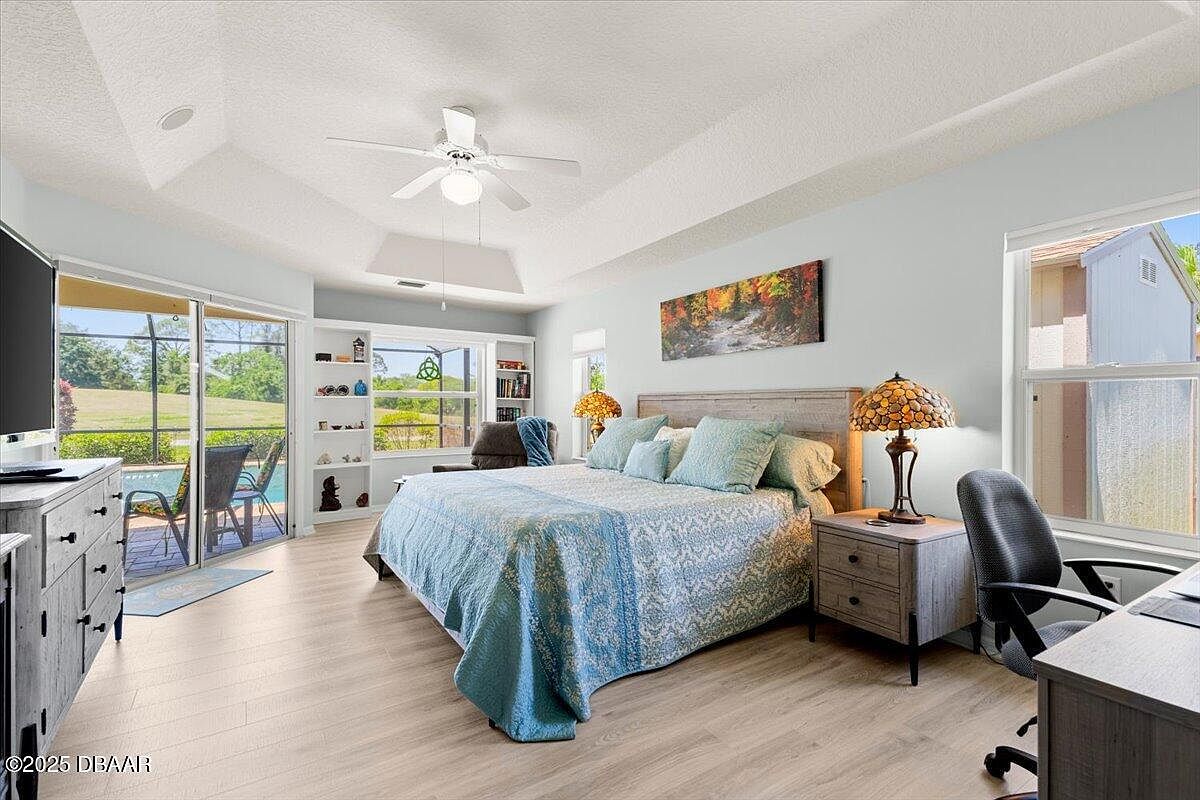 This spacious master bedroom features a calming palette of soft blues and neutral tones, creating a tranquil retreat. The large bed is adorned with a textured blue bedspread and multiple matching pillows, positioned against a light wooden headboard. To the right, a cozy work area includes a dark office chair and a desk near a bright window. An elegant stained-glass lamp on the bedside table adds warmth. Floor-to-ceiling windows and a sliding glass door provide abundant natural light and seamless outdoor pool access. Built-in shelving offers decorative and functional storage, while light wood flooring enhances the airy atmosphere.