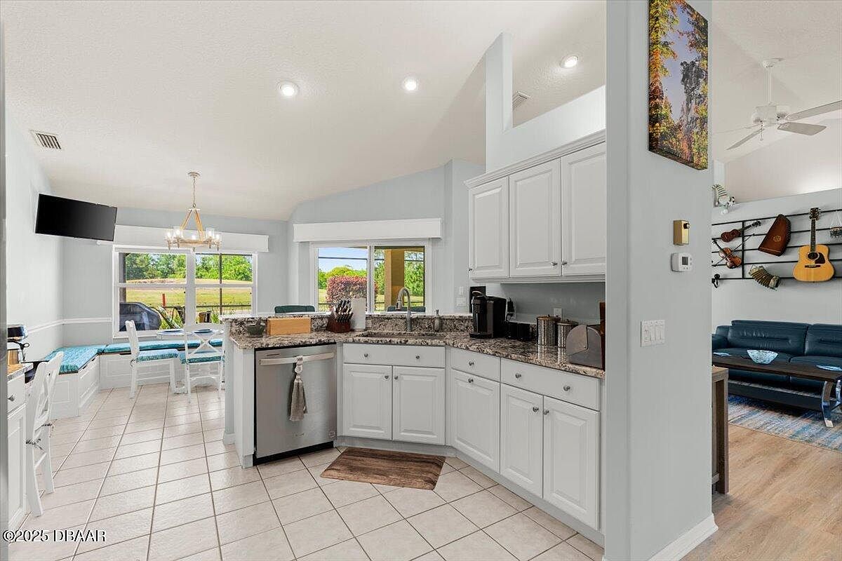 This inviting area features a clean and bright kitchen with white cabinetry and granite countertops arranged in an L-shape. Stainless steel appliances, including a dishwasher, complement the sleek, modern look. The kitchen opens to a cozy breakfast nook with white chairs and built-in bench seating upholstered in a vibrant teal fabric. A contemporary light fixture hangs above the nook, illuminating the space naturally through large sliding glass doors and wide windows that showcase soft green outdoor views. Adjacent living space displays a black leather couch and wall-mounted guitars, adding personality and warmth to the open-concept layout.
