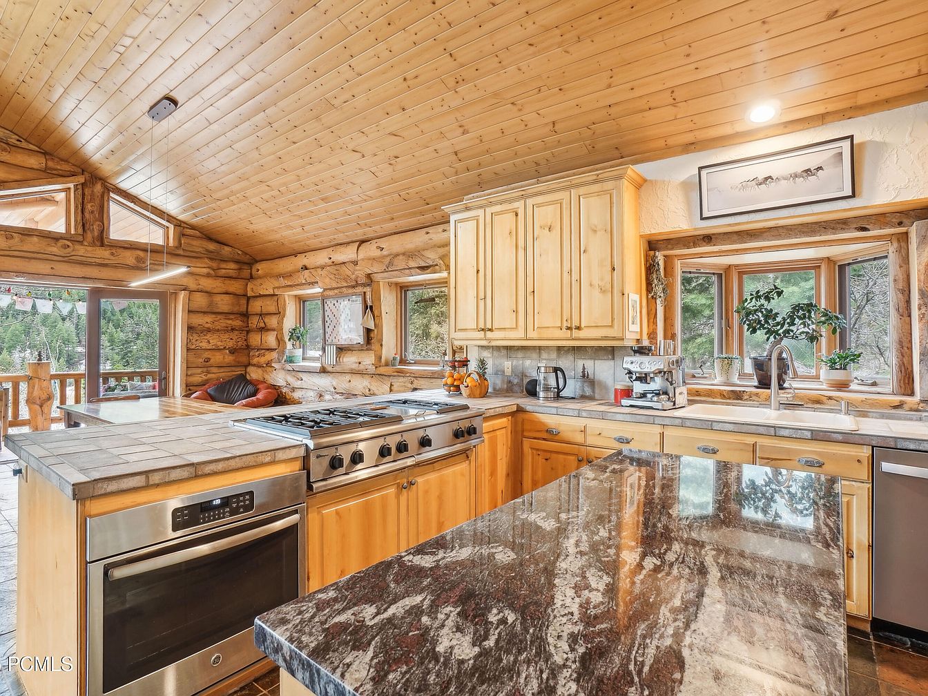 This kitchen blends rustic charm with modern functionality. The ceiling and walls made from natural wood logs and planks emphasize a cozy cabin ambiance. Light wooden cabinets offer ample storage while complementing the natural tones of the logs. The countertops are a mix of tiled surfaces and a striking dark granite island that catches the eye with its swirling patterns. Stainless steel appliances—including a large oven, gas stove, and dishwasher—offer contemporary convenience. Large windows with wooden frames bring in natural light and greenery views, enhancing the warm, welcoming atmosphere.