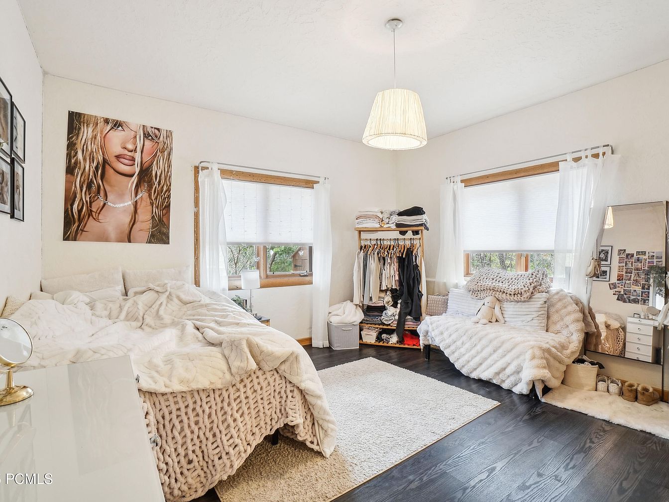 This bedroom corner combines comfort with casual style, featuring a plush seating area covered in soft, chunky knit throws and fluffy pillows, adding tactile warmth. Two large windows framed with sheer white curtains provide natural light while maintaining privacy with understated blinds. Light wooden window frames complement the dark wood flooring that stretches across the space. A simple clothing rack with neatly arranged garments and a full-length mirror leaning against the wall enhance the room’s casual and lived-in feel. The soft area rugs and minimalistic pendant light overhead balance coziness with modern aesthetics.