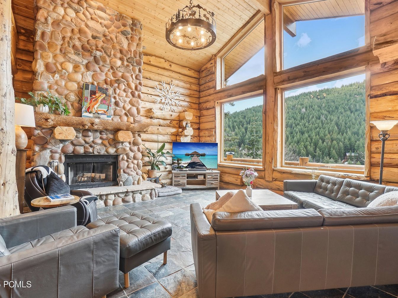 This cozy living room features a rustic mountain lodge style with natural log walls and an impressive stone fireplace as its focal point. The floor-to-ceiling windows allow abundant natural light and showcase breathtaking views of lush green pine forests. The furniture includes a sleek grey leather sectional and a matching armchair with ottoman, balancing modern aesthetics with the organic surroundings. The slate stone flooring complements the earthy tones of the space. A round, wrought-iron chandelier adds a warm, rustic charm overhead, while contemporary touches like the flat-screen TV and minimal décor create a comforting, stylish retreat.