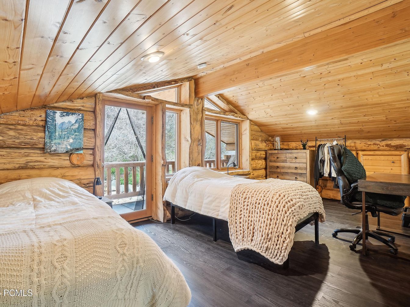 This loft bedroom features rustic charm with its wood-paneled ceiling and log cabin-style walls, creating a warm and inviting atmosphere. Two single beds, adorned with cozy knitted blankets and soft white bedding, are positioned to maximize space and comfort. A glass door and adjacent windows offer natural light and a view of the outdoors, while a small balcony railing visible outside enhances the connection to nature. Practical elements include a wooden dresser, a minimalist desk paired with an ergonomic black chair, and a clothes rack, blending functionality with a homely, rustic aesthetic.
