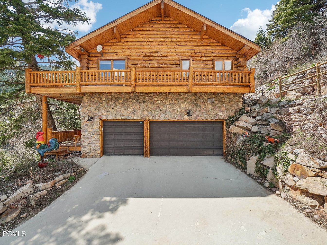 This mountain-style home features a charming rustic exterior with a two-car garage at the base, framed by natural river stones and robust wooden accents. Above the garage, a wooden balcony with log railings offers a cozy outdoor space, blending seamlessly with the cabin’s classic log construction. The stonework contrasts beautifully with the warm wood, enhancing the natural, earthy feel. The driveway slopes gently upward to the dark garage doors, while natural rock landscaping and evergreen trees frame the setting, contributing to the serene, wilderness-inspired aesthetic that complements the mountain surroundings.