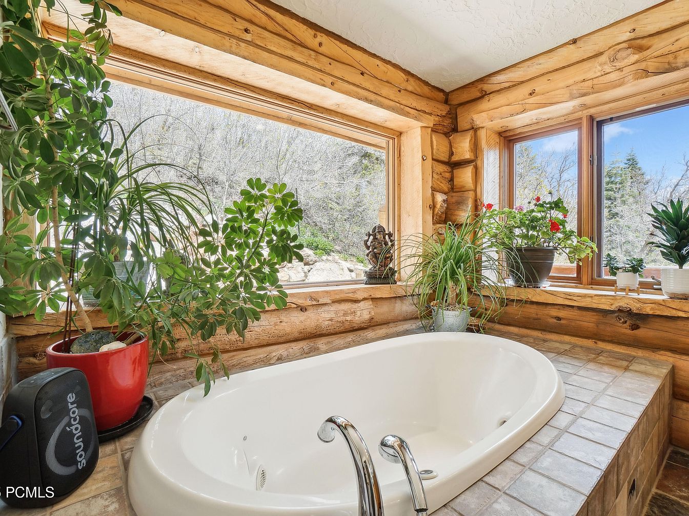 This bathing area features a cozy built-in soaking tub surrounded by large, square beige tiles with natural texture. The rustic log cabin walls bring warmth and an earthy vibe, enhanced by the exposed wood framing the generous corner windows. These windows allow abundant natural light, offering a serene view of the outdoors. Various green plants in pots and a small statue add a touch of nature and tranquility. A compact black speaker sits nearby to provide ambiance. The blend of natural elements, soft colors, and greenery creates a calming retreat perfect for relaxation and enjoying nature’s scenery.