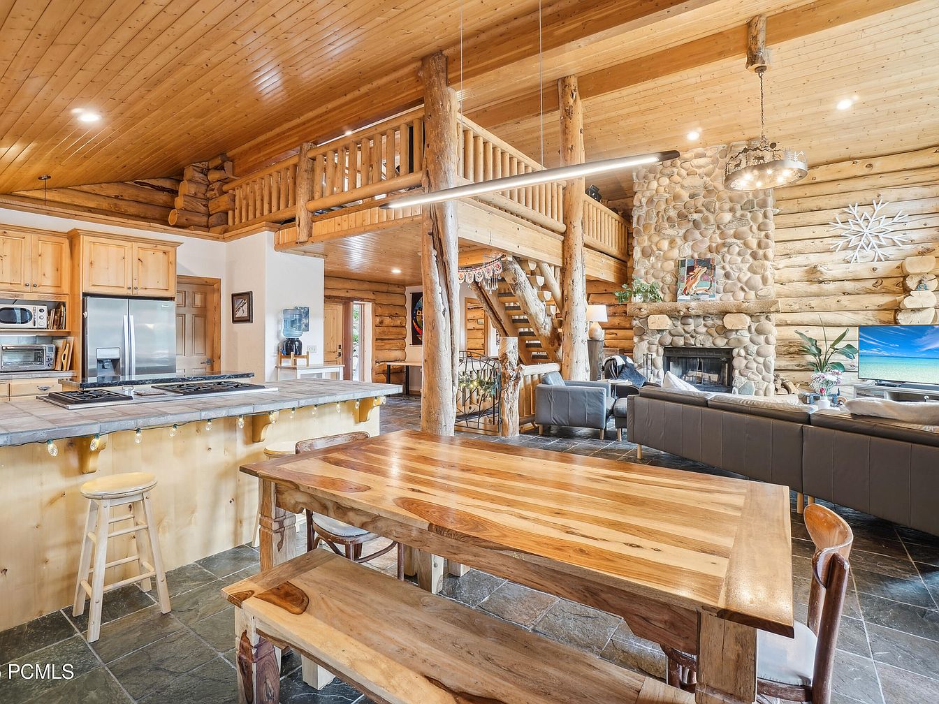 This space combines a rustic open-concept living and dining area featuring natural wood and stone elements. The ceiling and walls are clad in polished light wood planks and sturdy log beams, enhancing the cabin-inspired aesthetic. A large stone fireplace anchors the living area, surrounded by neutral gray sofas and armchairs, creating a cozy gathering spot. Adjacent to the living area is a wooden dining table with benches and chairs, showcasing rich, natural wood grain. The kitchen island includes a built-in cooktop and light wood cabinetry, complementing the earthy slate tile flooring. An open loft above adds architectural interest and warmth.