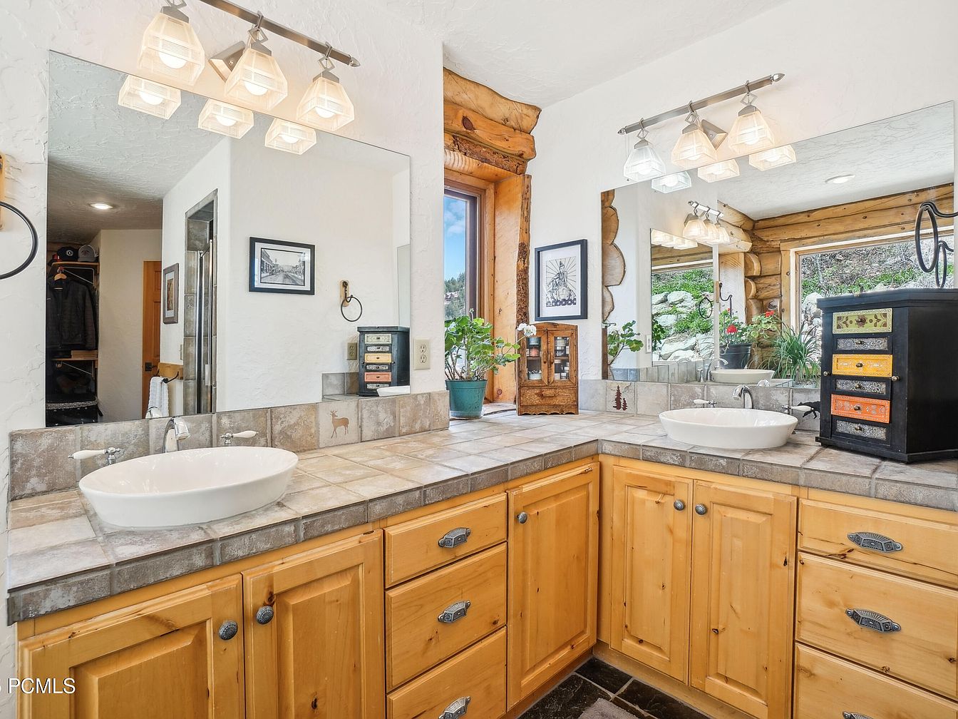 This bathroom features a spacious L-shaped vanity with natural wood cabinetry, lending a warm, rustic charm to the space. The tiled countertop in earthy tones complements the wood while providing durability. Dual vessel sinks sit atop the counter, paired with contemporary chrome faucets. Large mirrors stretch above the vanity, enhancing the sense of openness and reflecting natural light from two nearby windows framed with rough-hewn wood. Modern light fixtures with geometric glass shades offer ample illumination. Decorative accents like potted plants, framed black-and-white art, and a small, colorful multi-drawer organizer add personality to the space.