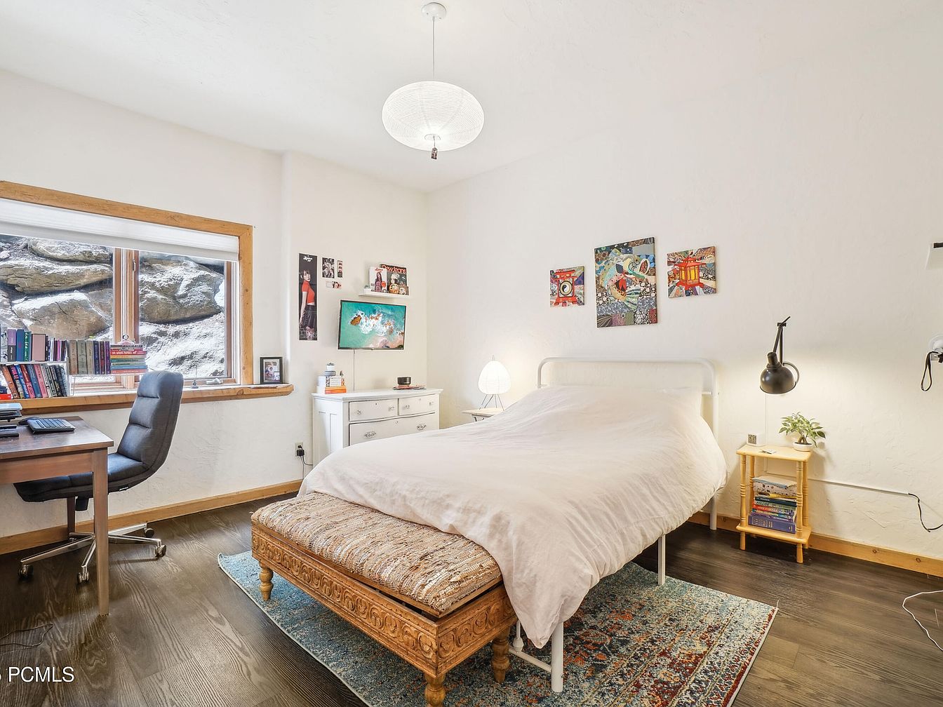 This bedroom blends functionality with comfort, featuring a simple white metal bed frame dressed in crisp white linens. A rustic wooden bench with intricate carvings sits at the foot of the bed, resting on a textured, patterned area rug that adds warmth and subtle color. Opposite the bed, a white dresser with decorative knobs holds a small lamp and various items, anchored beneath a cluster of vibrant, eclectic artwork on the wall. A wooden desk and black swivel chair are nestled under a window framed by natural wood trim, allowing natural light to brighten the space. The earthy wood flooring and minimalistic pendant light complete this serene yet practical retreat.