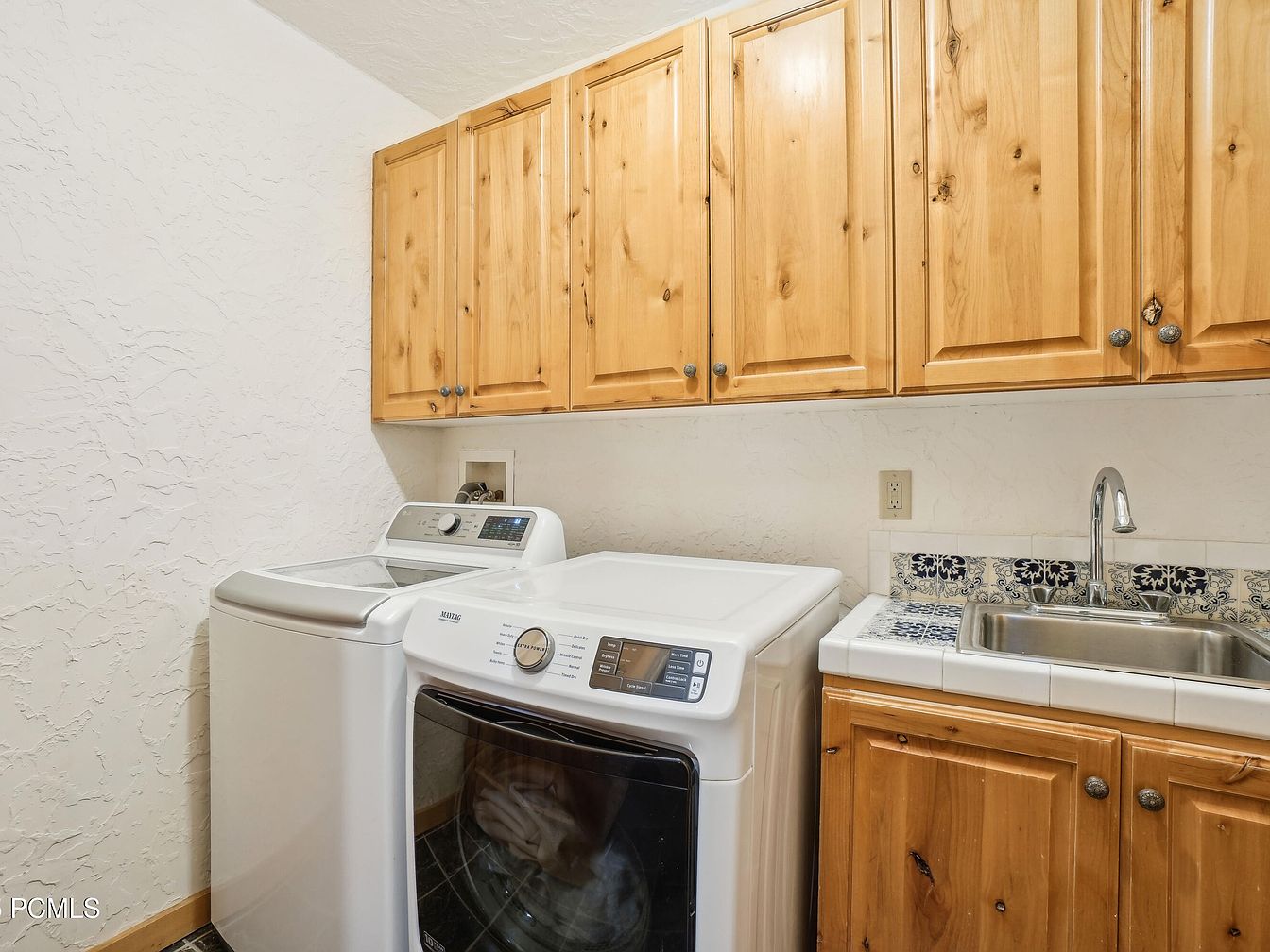 This laundry space features a functional yet cozy layout with a modern washer and dryer positioned side-by-side. Natural wood cabinetry lines the wall above and below the countertop, lending a warm, earthy vibe that contrasts nicely with the clean white appliances. The textured walls in a subtle cream color create softness around the room. A practical stainless steel sink with a polished chrome faucet is inset into a tiled countertop adorned with decorative blue and white patterned tiles, adding a touch of artisanal charm while providing a useful area for hand washing and stain treatment.