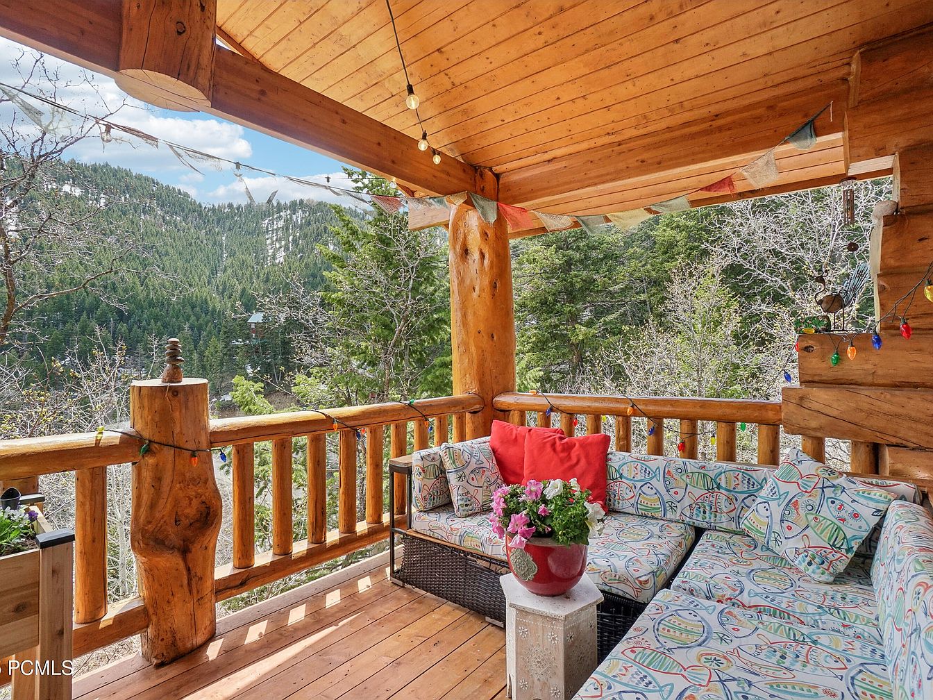 This cozy balcony offers a sheltered outdoor living space framed by thick, natural wooden beams and railings, enhancing a rustic cabin vibe. The warm wood ceiling and floor complement the surrounding forest scenery, visible through the open air. A comfortable L-shaped wicker sofa adorned with playful, multicolored fish-patterned cushions and bright red accent pillows invites relaxation. String lights and festive prayer flags add a whimsical, personal touch, ideal for evening ambience. A small concrete side table topped with a vibrant flowerpot enhances the natural, earthy aesthetic, blending outdoor beauty with comfort perfectly.