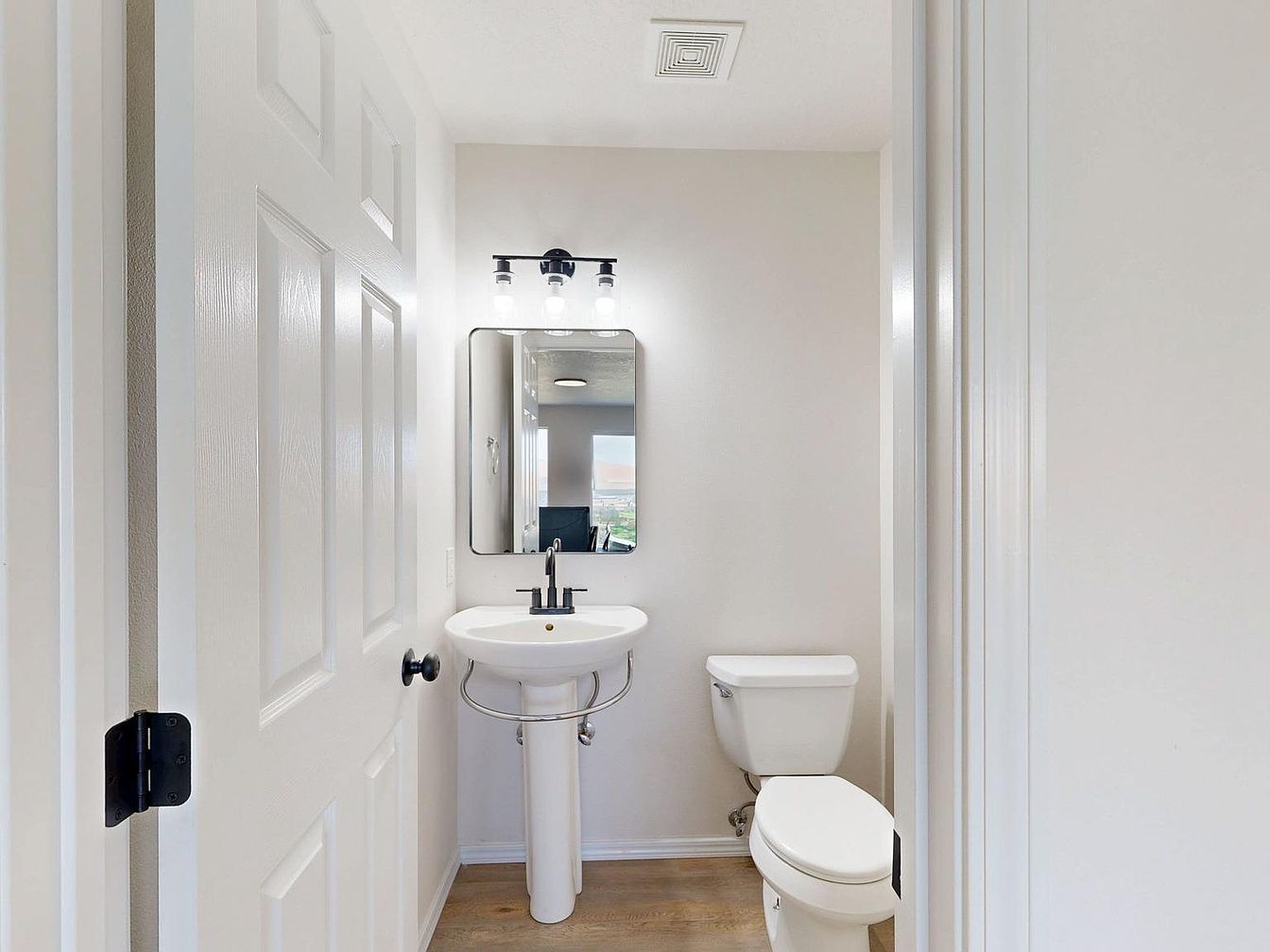 This compact guest bathroom embraces a minimalist style with a neutral color palette of white and light beige tones that enhance its brightness. The room features a sleek white pedestal sink with a modern matte black faucet, paired with a rectangular, frameless mirror above it. A three-light black vanity fixture adds both style and sufficient illumination. The white toilet complements the overall crisp, clean design. Natural wood-look flooring adds warmth and contrast, while simple, white paneled doors frame this efficient space, creating a welcoming and practical powder room.