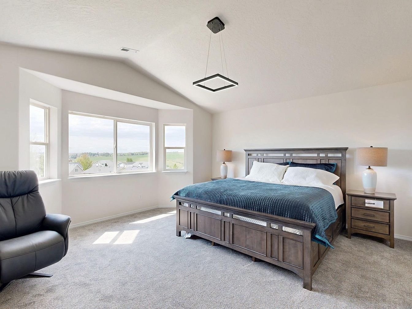 This spacious master bedroom features a neutral color palette with soft white walls and light gray carpeting that enhances natural light from a charming bay window set with three panels. The wooden bed frame and matching nightstands in a warm, medium-toned finish anchor the room with traditional craftsmanship details. A deep blue quilt and contrasting white pillows add a sophisticated pop of color. Placed at the corner is a modern black leather armchair that introduces a contemporary element. Above, a sleek geometric pendant light hangs from the vaulted ceiling, adding clean, minimalist character to this serene and inviting retreat.