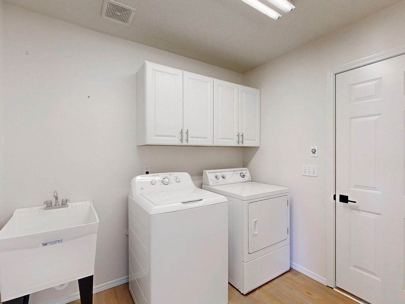 This compact laundry room features a neat and functional design with a soft, neutral color palette dominated by white walls and cabinetry. The space houses a top-load washing machine and a dryer side by side, facilitating efficient laundry tasks. Above them, sleek white cabinets with silver handles provide storage for detergents and cleaning essentials. Adjacent to the machines, a large utility sink offers convenience for hand washing or pre-treating stains. The room has light wood flooring which adds warmth, contrasted by an understated white door with black hardware, enhancing the clean, modern aesthetic. A simple fluorescent ceiling light illuminates the area effectively.