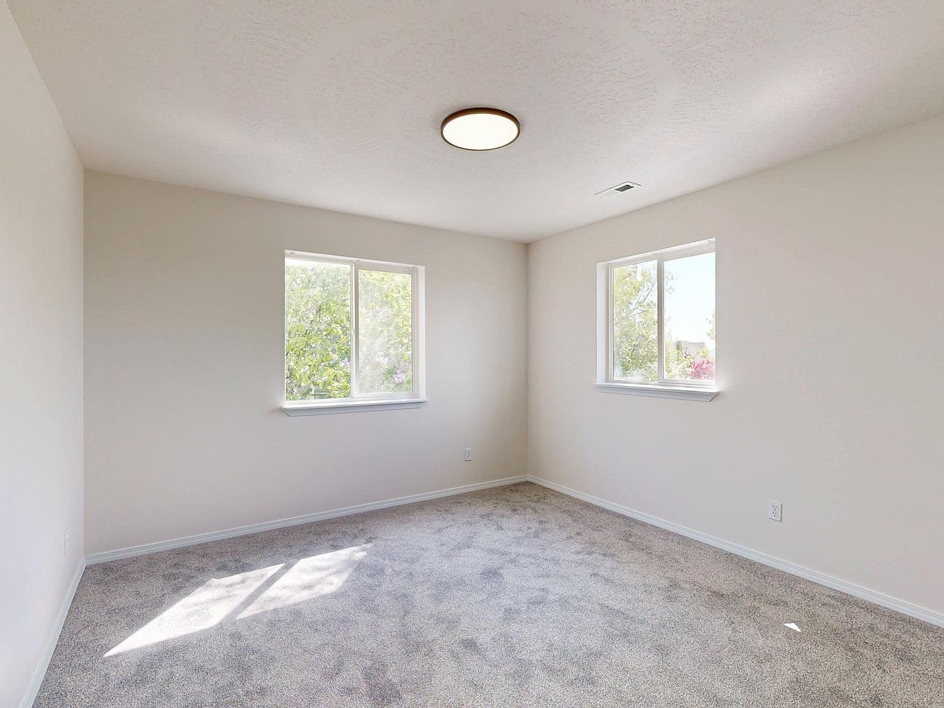 This bright and airy bedroom features neutral tones with soft beige walls and light gray carpeting, creating a calm and inviting atmosphere. Two large windows on adjacent walls allow ample natural light to flood the space, highlighting the subtle texture of the carpet. The ceiling boasts a modern, flush-mount circular light fixture that complements the minimalist design. White baseboards and simple window trims add a clean finish that blends seamlessly with the wall color. The room’s open layout offers versatile space for furniture arrangement, ideal for a peaceful and functional private retreat.