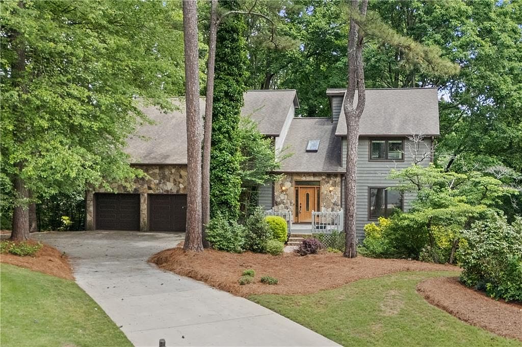 This beautiful home, located in an esteemed cul de sac lot in Roswell, GA, exemplifies a modern/soft contemporary architectural style. Situated in the coveted East Spring Lake community, it offers a harmonious blend of an open concept floorplan with a warm, homey and functional living environment. The welcoming entry foyer leads to versatile spaces like a living/office/music/play area and a stunning dining room highlighted by true hardwood floors. The large vaulted great room with a fireplace and slate flooring bathes in natural light, evoking a serene treehouse ambiance. The well-appointed cook’s kitchen features a gas cooktop with a prep island, an eat-in area, convection oven/microwave, a large walk-in pantry, home organization desk, wine holder, double sinks, and ample hardwood cabinetry. It opens seamlessly to a grilling deck, perfect for outdoor entertaining. Uncommonly for the community, the home includes a full bedroom and bath on the main level, ideal for family or guests. Casement windows throughout the residence offer lovely views of the surrounding wooded setting. Upstairs, the spacious primary suite includes a large closet and a renovated master bath with new counters, lighting, and flooring. Two additional sizeable bedrooms share a roomy bath and feature large closets. The expansive laundry room is also located on this level. The terrace level serves as a versatile space with a teen or in-law suite including bedroom and bath, a media/entertainment area with an oversized bar, office space, and patio access. The large backyard is wooded and includes a path leading to one of the community’s nature-filled lakes. Recent updates include new carpet and fresh paint throughout the home. It is professionally cleaned and move-in ready. Priced at $795,000, this home offers excellent access to top schools, the Historic Roswell district, shopping, highways, and numerous recreational amenities such as swimming, tennis, and pickleball in a family-friendly lakeside community.