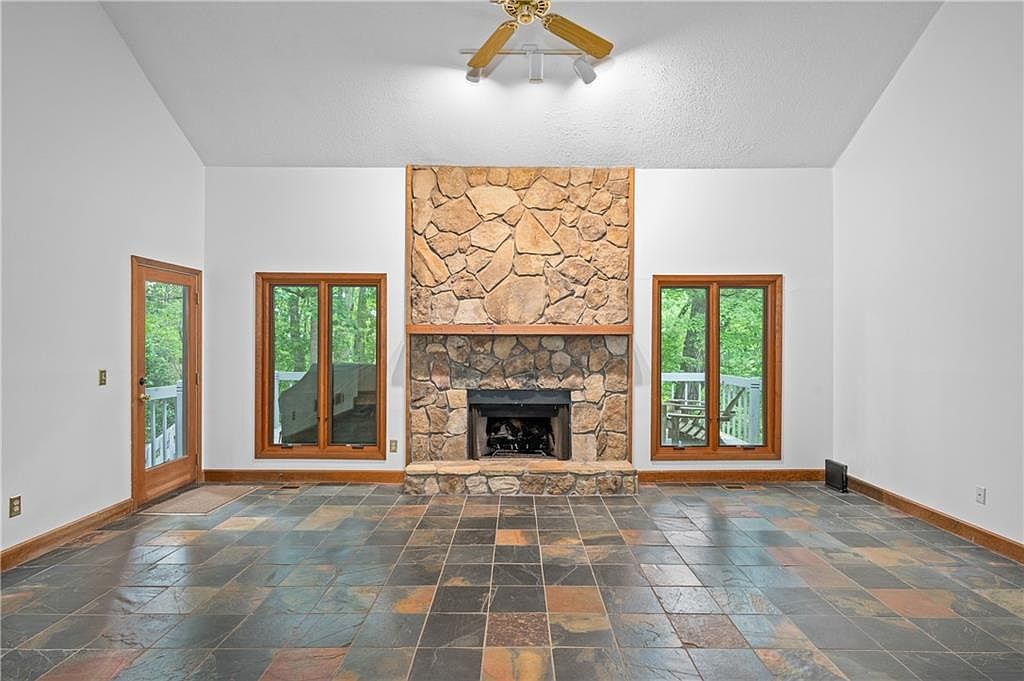 This living room features a striking floor-to-ceiling stone fireplace as its centerpiece, flanked symmetrically by two medium-sized wooden-framed windows that invite natural light and a view of the surrounding greenery. The floor is covered with large square slate tiles in earth tones, enhancing the room’s natural and rustic appeal. Neutral white walls contrast with the warm wood trim around the windows, door, and baseboards. A wooden door with glass panels leads out to a deck or porch, suggesting a seamless indoor-outdoor flow. The ceiling is vaulted, adding spaciousness, complemented by a ceiling fan with wooden blades and track lighting for illumination.