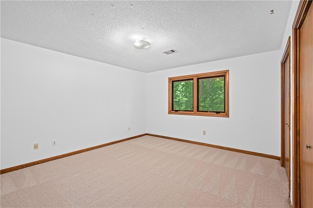 This quiet bedroom features a simple and functional layout with clean white walls enhancing the room’s brightness. The ceiling has a textured finish complemented by a modest dome light fixture centered overhead. The beige carpet adds warmth and softness underfoot while contrasting gently with the wooden trim that outlines the baseboards, window frame, and closet doors. A pair of medium wood-toned closet doors lines one wall, balancing the natural wood window frame that showcases lush greenery outside. The overall aesthetic is neutral and blank, offering a versatile backdrop for personal decor and furnishings.