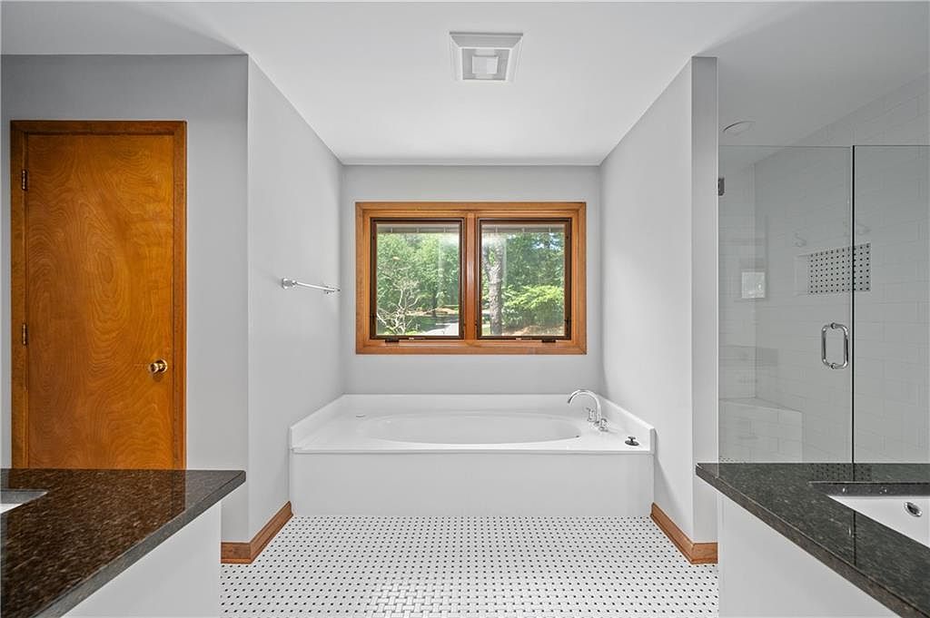 This bathroom features a recessed white soaking tub centered beneath a wooden-framed window, allowing natural light to flood the space and offering a calming view of greenery outside. The walls are painted a soft gray, creating a neutral and modern ambiance that contrasts elegantly with the warm natural wood tones of the door and window frame. The floor is decorated with a patterned white tile with small black accents, adding subtle visual interest and texture. Opposite the tub, dark granite countertops with undermount sinks flank either side, contributing a sleek and polished touch. A clear glass shower door is partially visible, hinting at a spacious, clean-lined shower area.