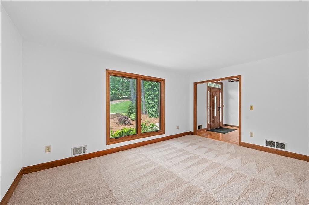 This space serves as a welcoming living area directly adjacent to the home’s front entryway, visible through a wide doorway featuring natural wood trim. The room features a light beige carpet with visible vacuum lines, contrasting elegantly with crisp white walls. A large double-pane window framed in matching wood offers a tranquil view of the lush greenery outside while inviting natural light inside. The transition from carpet to hardwood near the front door highlights distinct zones within the open layout, while subtle vent placements and electrical outlets are integrated discreetly along the baseboards, maintaining a clean, uncluttered aesthetic.