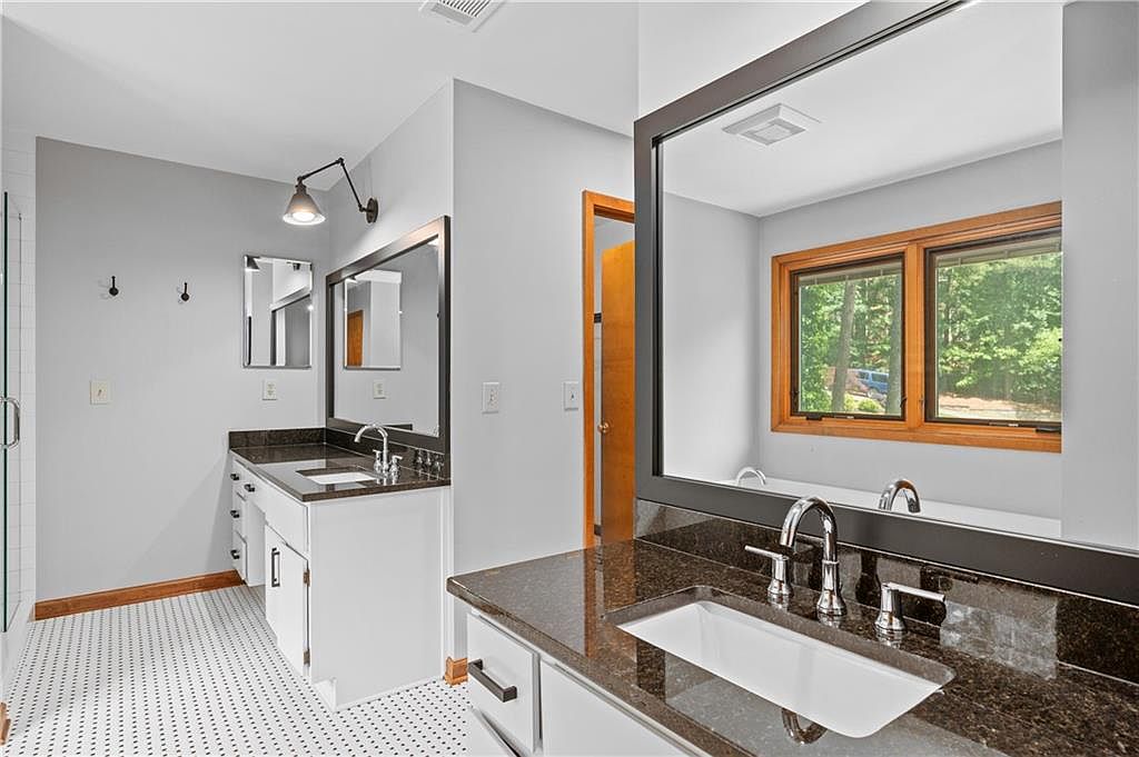 This bathroom features a clean, contemporary design highlighted by white cabinetry contrasted with a dark granite countertop that adds a touch of elegance. Twin undermount sinks are complemented by polished chrome fixtures, enhancing the sleek look. A large horizontal mirror with a black frame spans the wall above the countertop, reflecting natural light from the adjacent window framed in natural wood, which introduces warm tones and a connection to the outdoors. The floor is tiled with a white base and subtle black dots, providing a vintage flair. The walls are painted a soft gray, maintaining a neutral backdrop while accentuating the wood trim and door. Simple black metal hardware and minimal decorative elements contribute to a functional yet stylish atmosphere.