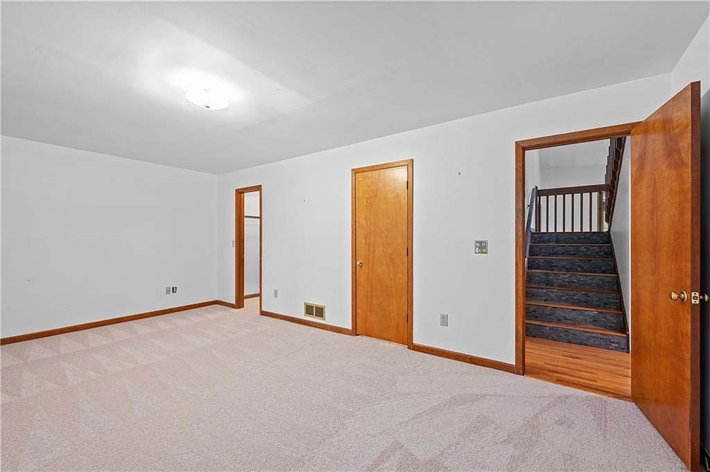This space serves as a clean and versatile basement or rec room featuring neutral cream carpet flooring and white painted walls, complemented by honey-toned wooden baseboards and door trims. The room includes two closed wooden doors for storage or access to utilities and an open door leading to a stairway with dark carpeting and wooden railing. The ceiling is equipped with a recessed flush-mounted light fixture, providing ample illumination. The minimalistic and fresh design invites customization for a cozy entertainment area or extra living space while maintaining a simple, welcoming vibe.