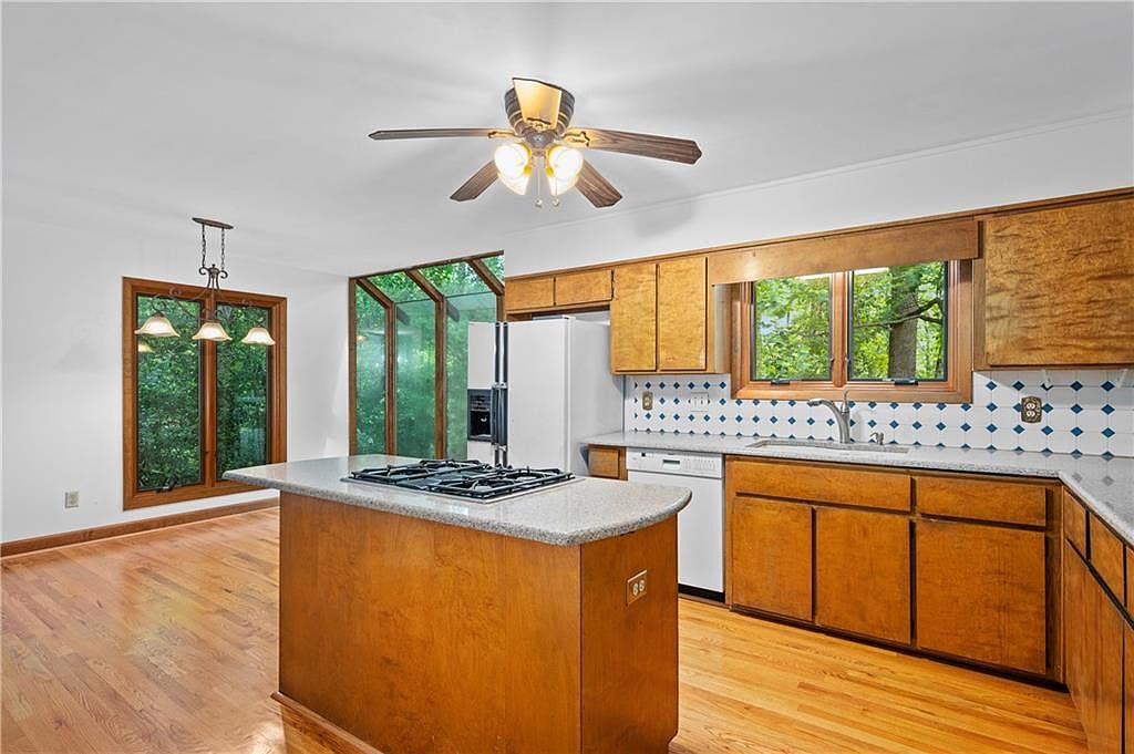 This bright kitchen features honey-toned wooden cabinetry paired with light gray countertops and a coordinating kitchen island with a built-in gas cooktop. The backsplash is white with a subtle blue diamond pattern, adding a touch of color. Natural light floods the space through large wood-framed windows above the sink and a multi-panel glass door leading to an outdoor area, enhancing the airy feeling. The dining nook to the left includes a stepped chandelier hanging over the space. Warm hardwood floors extend throughout, complementing the cabinetry and unifying the space. A ceiling fan with lights centers the room, providing both airflow and ambiance.