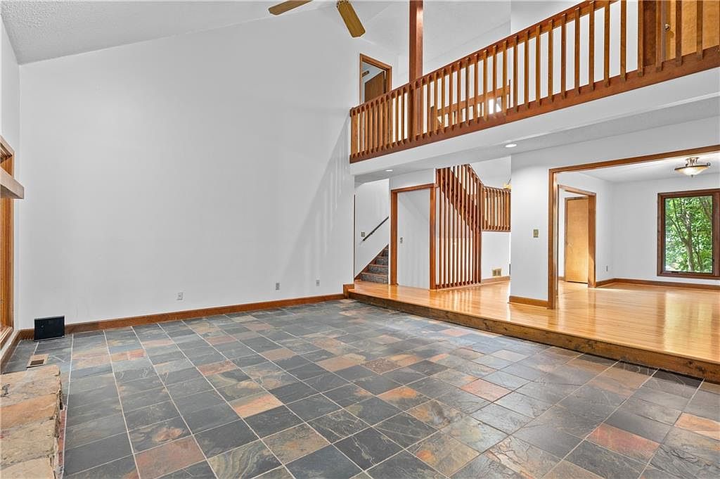 This spacious living room features a dramatic vaulted ceiling with a natural wood ceiling fan, creating an airy and open atmosphere. The floor consists of multi-toned slate tiles with earthy hues of gray, rust, and tan, adding texture and warmth. A raised wooden trim delineates the living room from the adjacent areas, highlighting a step up to honey-toned hardwood floors that continue through nearby rooms and the staircase. The open upper loft with a wooden railing offers additional visual interest and connects the rooms vertically. White walls and natural wood accents throughout evoke a rustic yet modern aesthetic.