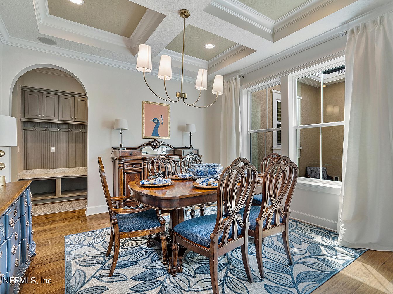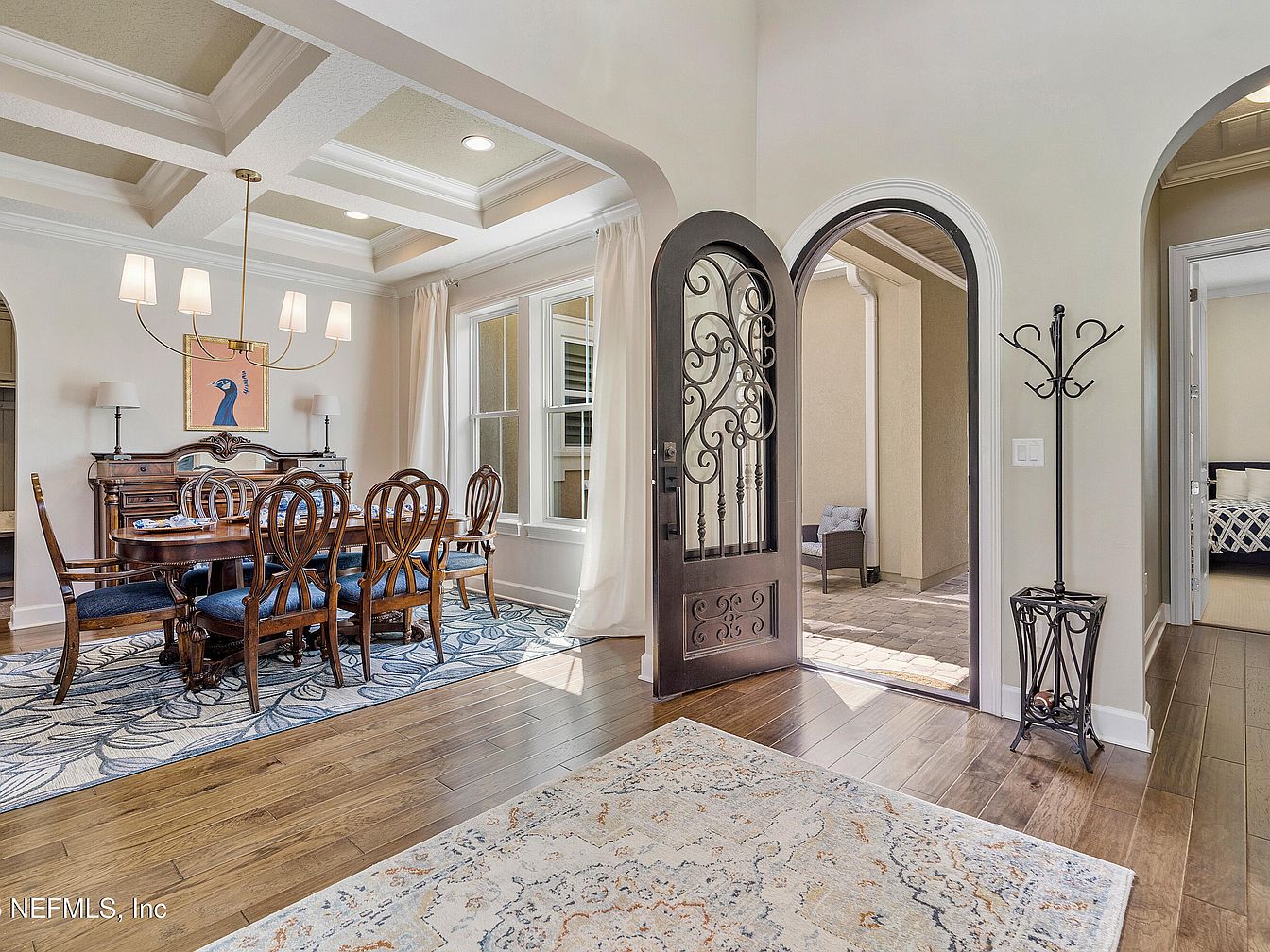 This inviting entryway opens to a sophisticated dining room framed by elegant coffered ceilings with recessed lighting. The warm wood flooring extends throughout, complementing the rich wood dining set that seats eight with beautifully curved chair backs and deep blue cushions. A soft floral-patterned rug grounds the dining area, while sheer white curtains soften natural light from the large windows. The intricately designed wrought iron front door adds a touch of old-world charm and contrasts with light neutral walls. Adjacent arched doorways lead to the cozy porch and a glimpse of a bedroom, enhancing the home’s open flow.