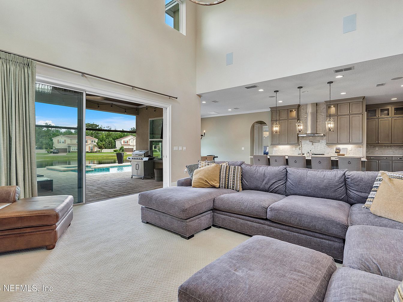 This living room features a spacious, open-plan design with a soaring double-height ceiling, creating an airy and grand ambiance. A large, plush gray sectional sofa dominates the seating area, complemented by patterned throw pillows for added texture and warmth. Adjacent is a brown leather ottoman, adding a contrasting yet cozy touch. The room opens via wide sliding glass doors to an outdoor patio and pool area, providing abundant natural light and seamless indoor-outdoor flow. Beyond the living space, the kitchen is visible with taupe cabinetry, a large island with multiple gray bar stools, pendant lighting, and stainless-steel appliances, blending functionality with modern elegance.