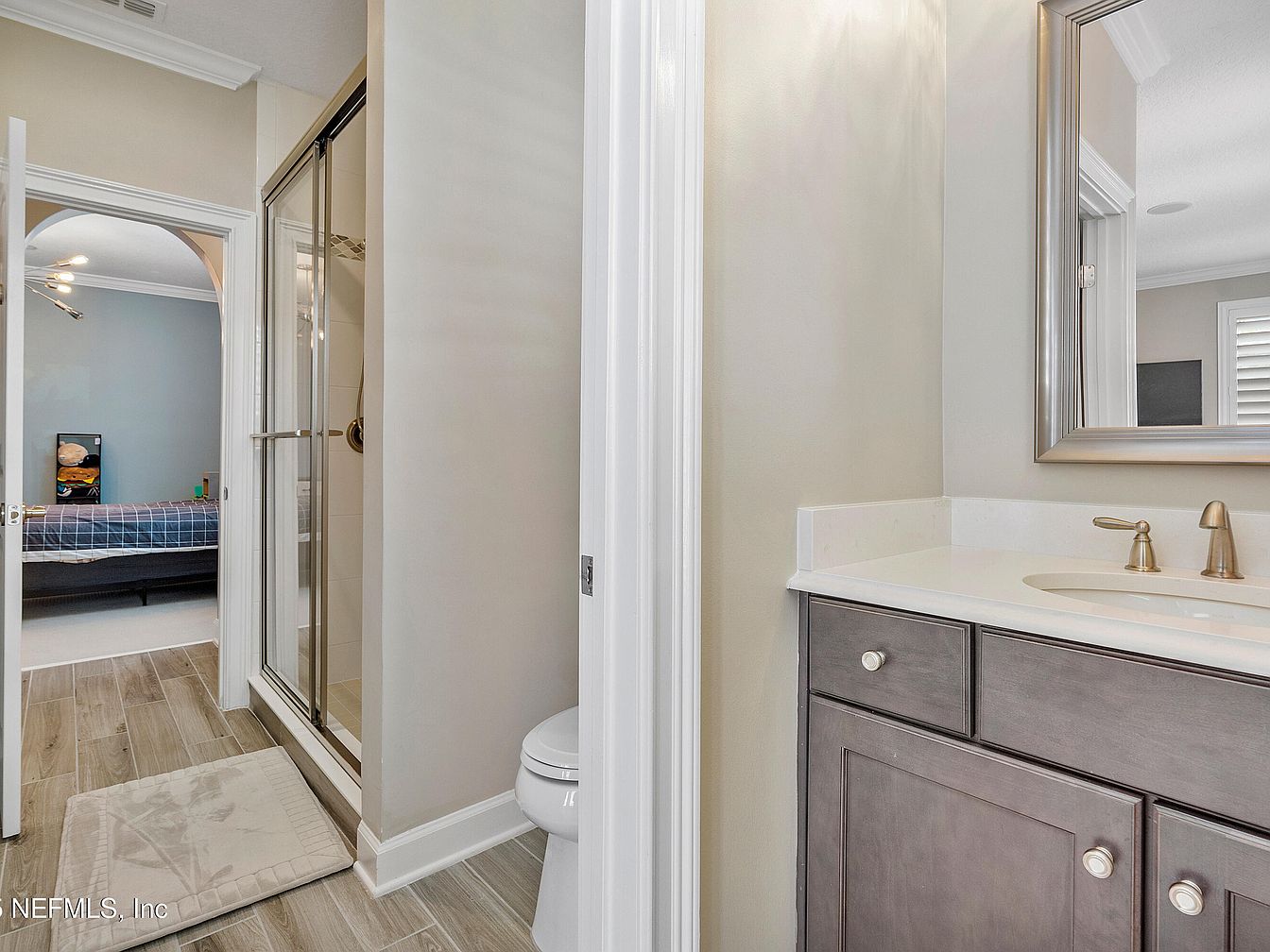 This transitional bathroom features a soft neutral palette with beige and gray tones complementing natural wood-look tile flooring that extends to the bedroom. A dark wood vanity with a sleek white countertop hosts a modern fixture beneath a sizeable silver-framed mirror. The walk-in shower includes clear glass doors with chrome accents, adding a clean, airy feel. Adjacent to the bathroom, a glimpse into the bedroom reveals a blue-gray accent wall behind a neatly made bed with grid-patterned bedding, blending comfort with understated contemporary design. Crown molding and white trim enhance the architectural elegance throughout.